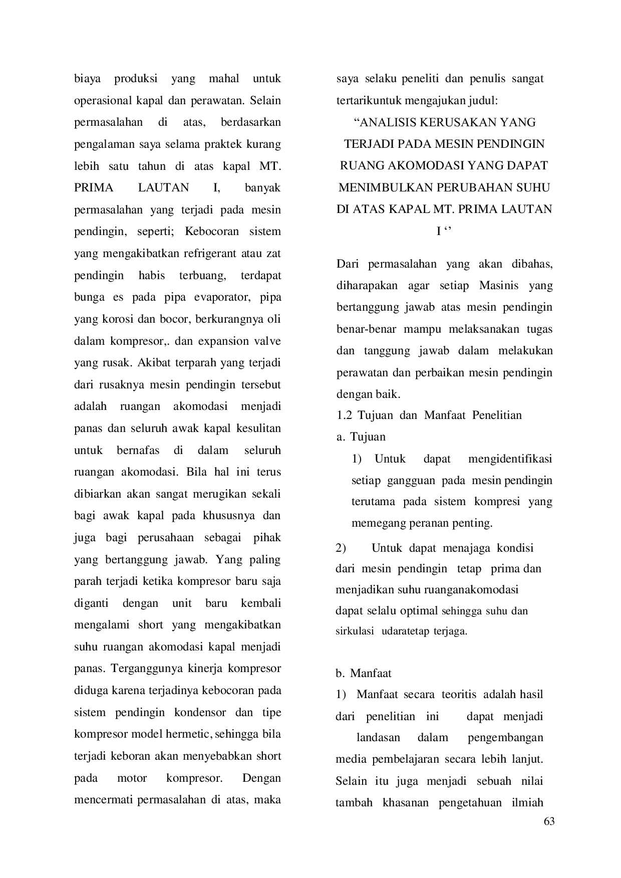 Kerusakan pada mesin pendingin kapal dapat disebabkan oleh kebocoran pipa akibat korosi atau pemasangan yang kurang baik, serta kerusakan pada kompresor yang seringkali disebabkan oleh kebocoran pada kondensor.Perawatan berkala sesuai dengan manual book sangat penting untuk menjaga kinerja mesin pendingin dan mencegah kerusakan yang lebih parah.Mengganti unit kompresor dengan yang baru merupakan solusi efektif, namun memerlukan dukungan dari perusahaan terkait ketersediaan sparepart.