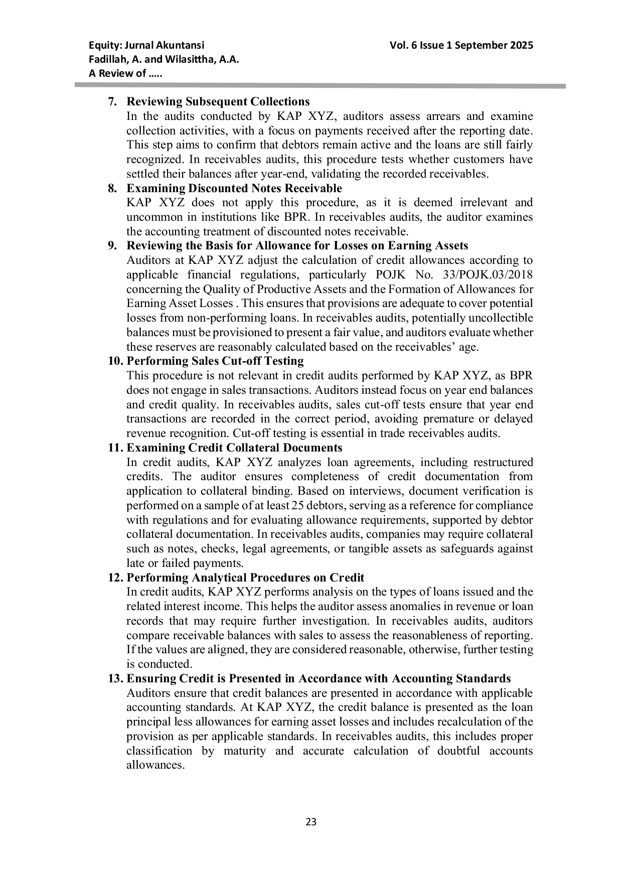 Berdasarkan penelitian, dapat disimpulkan bahwa prosedur audit kredit yang diterapkan oleh KAP XYZ selaras dengan prosedur audit piutang secara umum.Penyesuaian prosedur dilakukan untuk mengakomodasi karakteristik unik BPR, khususnya dalam hal penyesuaian terhadap pedoman audit standar.Hal ini menunjukkan bahwa KAP XYZ mampu mengidentifikasi risiko dan memastikan keandalan informasi keuangan yang disajikan BPR secara efektif.