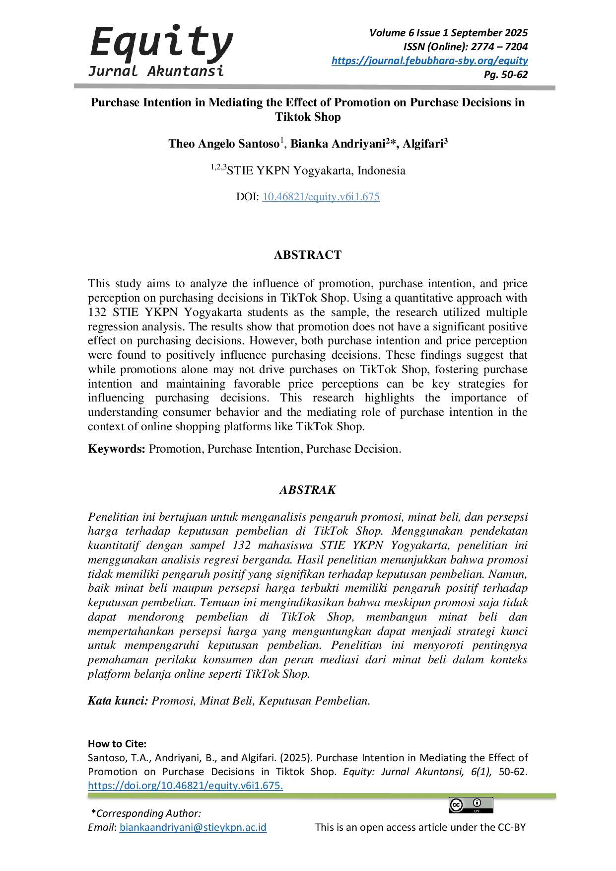 Equity: Jurnal AkuntansiEquity: Jurnal AkuntansiPenelitian ini bertujuan untuk menganalisis pengaruh promosi, minat beli, dan persepsi harga terhadap keputusan pembelian di TikTok Shop. Menggunakan pendekatan kuantitatif dengan sampel 132 mahasiswa STIE YKPN Yogyakarta, penelitian ini menggunakan analisis regresi berganda. Hasil penelitian menunjukkan bahwa promosi tidak memiliki pengaruh positif yang signifikan terhadap keputusan pembelian. Namun, baik minat beli maupun persepsi harga terbukti memiliki pengaruh positif terhadap keputusan pembelian. Temuan ini mengindikasikan bahwa meskipun promosi saja tidak dapat mendorong pembelian di TikTok Shop, membangun minat beli dan mempertahankan persepsi harga yang menguntungkan dapat menjadi strategi kunci untuk mempengaruhi keputusan pembelian. Penelitian ini menyoroti pentingnya pemahaman perilaku konsumen dan peran mediasi dari minat beli dalam konteks platform belanja online seperti TikTok Shop.