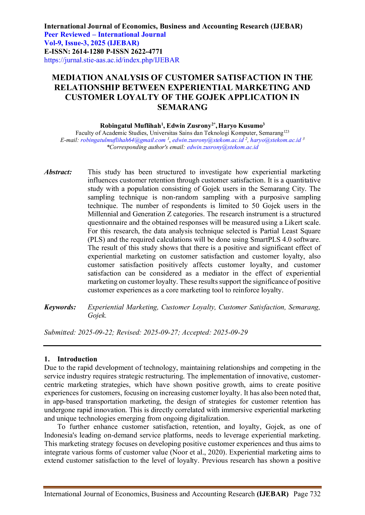 International Journal of Economics, Business and Accounting Research (IJEBAR)International Journal of Economics, Business and Accounting Research (IJEBAR)Penelitian ini dirancang untuk menyelidiki bagaimana experiential marketing memengaruhi retensi pelanggan melalui kepuasan pelanggan. Pendekatan yang digunakan adalah kuantitatif dengan populasi pengguna Gojek di Kota Semarang, menggunakan teknik sampling purposif non‑acak sebanyak 50 responden yang termasuk dalam kategori Milenial dan Generasi Z. Instrumen penelitian berupa kuesioner terstruktur yang diukur dengan skala Likert, dan teknik analisis data yang dipilih adalah Partial Least Square (PLS) dengan perhitungan menggunakan perangkat lunak SmartPLS 4.0. Hasil penelitian menunjukkan adanya pengaruh positif dan signifikan experiential marketing terhadap kepuasan pelanggan serta loyalitas pelanggan; kepuasan pelanggan juga berpengaruh positif terhadap loyalitas, dan dapat berfungsi sebagai mediator pada pengaruh experiential marketing terhadap loyalitas pelanggan. Temuan ini menegaskan pentingnya pengalaman pelanggan sebagai alat pemasaran utama untuk memperkuat loyalitas.