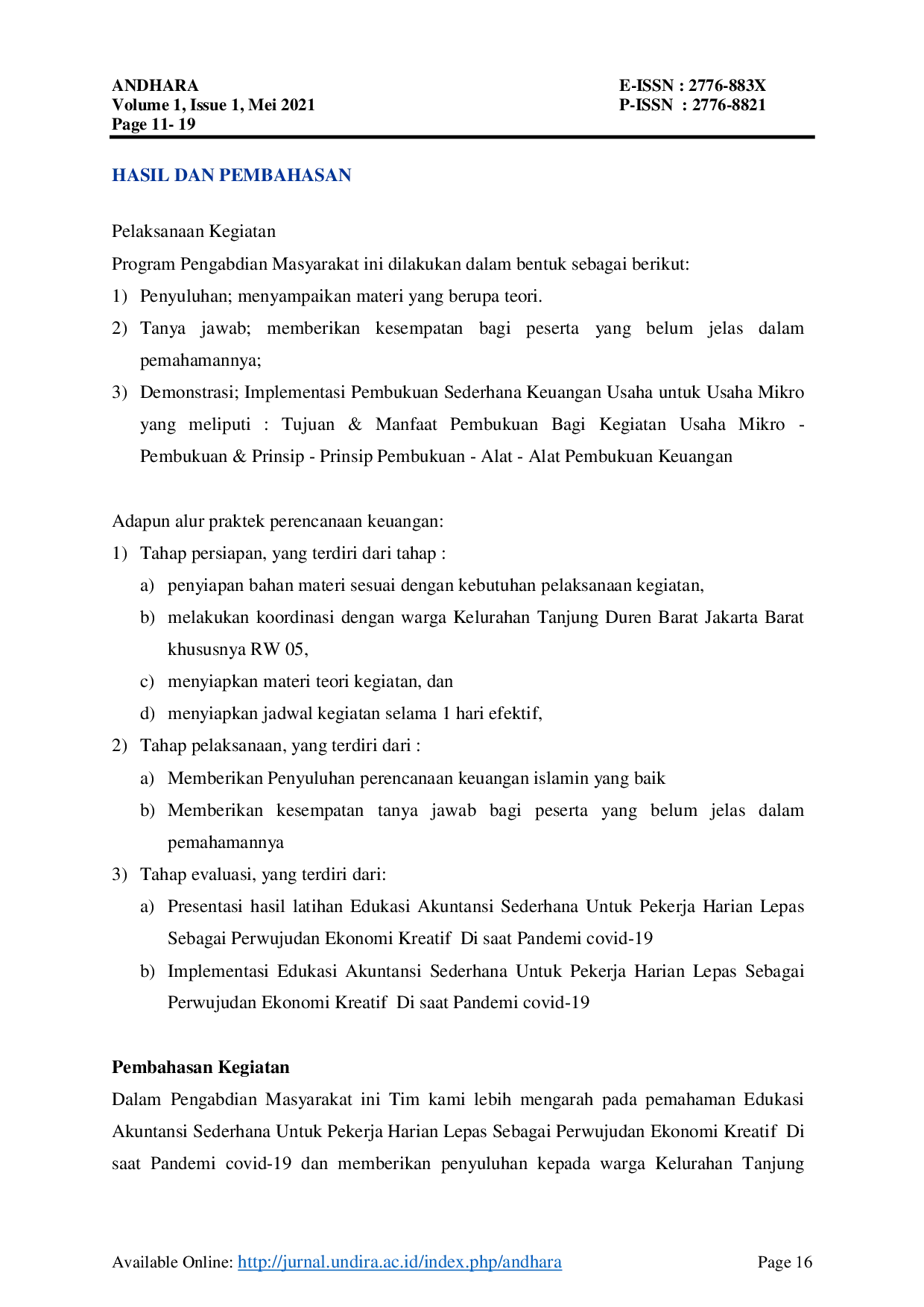 AndharaAndharaAdanya pandemi virus COVID-19 menyebabkan berbagai macam persoalan serius di seluruh lini sektor kehidupan masyarakat. Mulai dari persoalan ekonomi, sosial, politik, hingga ketenagakerjaan. Di Indonesia pun, wabah pandemi virus COVID-19 “telah memaksa pemerintah untuk mengeluarkan kebijakan khusus dengan menghimbau penghentian sementara aktivitas-aktivitas yang menimbulkan kerumunan, seperti aktivitas pendidikan di sekolah, pekerjaan di perusahaan, kegiatan di ruang umum, hingga keagamaan di rumah ibadah. Ketika kondisi pandemi virus corona atau COVID-19 seperti saat ini, yang paling terdampak adalah para pekerja harian lepas. Mau tidak mau, mereka harus benar-benar tahu bagaimana cara mengatur uang agar bisa tetap bertahan di tengah pandemi seperti saat ini. Dalam kegiatan pengabdian kali ini target yang ingin dicapai adalah (1) Para peserta Edukasi Akuntansi Sederhana memahami pentingnya perencanaan dan pencatatan keuangan (2) Para peserta Edukasi Akuntansi Sederhana bersedia mengikuti pelatihan tentang pembuatan suatu perencanaan dan pencatatan keuangan yang sederhana, namun cukup baik untuk diterapkan pada kegiatan usaha peserta dan (3) Para peserta Edukasi Akuntansi Sederhana memahami pembuatan perencanaan dan pencatatan keuangan yang sederhana.