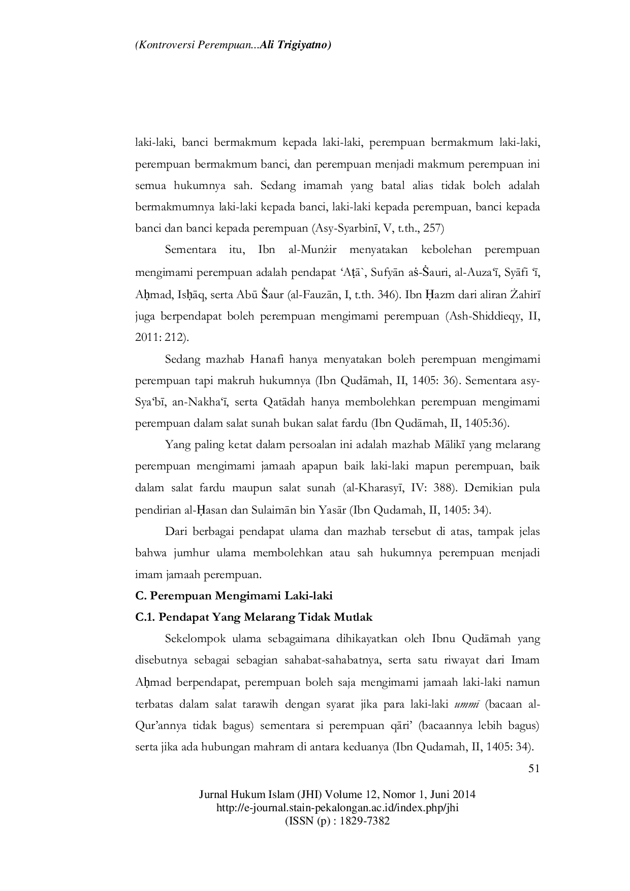 Jurnal Hukum IslamJurnal Hukum IslamSalah satu isu perempuan yang telah diperjuangkan adalah kesetaraan di setiap sektor, termasuk sektor keagamaan, yaitu shalat. Dalam konteks ini, beberapa perempuan—di antaranya Amina Wadud—memperkenalkan bahkan mengemukakan pendapat bahwa perempuan dapat menjadi imam salat di tempat terbuka dengan jamaah yang beragam, baik laki‑laki maupun perempuan, dan hal tersebut sah. Meskipun pendapat ini bukanlah hal baru, karena sebelumnya al‑Muzani, Abu Saur, dan Ibnu Jarir at‑Tabari telah mengeluarkan fatwa yang memperbolehkannya, para fuqaha cenderung melarang dan menolak hal tersebut. Artikel ini berupaya menggambarkan perbedaan pendapat (khilafiyah) tersebut secara lengkap dengan melibatkan ulama serta argumen‑argumen yang menjadi dasarnya.