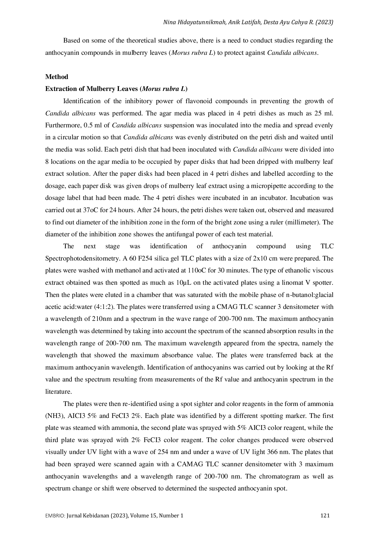 EMBRIO: Jurnal KebidananEMBRIO: Jurnal KebidananInfeksi yang disebabkan oleh Candida albicans umum terjadi pada mukosa vagina atau disebut Vulvo Vaginal Candidiasi (VVC). Pengobatan secara herbal dibuktikan bahwa dapat menjadi salah satu alternatif untuk mengatasi kondisi kandidiasis vagina. Daun mulberry memiliki banyak senyawa kimia salah satunya adalah antosianin. Antosianin dapat melindungi dari bakteri patogen manusia yang memiliki manfaat farmakologis dan aktivitas biologi. Tujuan penelitian melihat senyawa antosianin dari daun mulberry (Morus Rubra L) terhadap antifungi Candida albicans. Identifikasi senyawa pada daun mulberry (Morus Rubra L) menggunakan alat KLT Spektrofotodensitometri pada plat silika gel 60 F254 yang dicuci dengan methanol dan diaktifasi dengan suhu 110°C selama 30 menit. Plat akan dielusi pada chamber yang telah jenuh dengan fase gerak n-butanol:asam asetat glasial:air (4:1:2) dan dipindahi dengan menggunakan alat densitometer CMAG TLC spektrum dalam rentang gelombang 200-700 nm. Pengamatan senyawa anthocyanin daun mulberry terhadap antifungi Candida albicans menggunakan desain penelitian eksperimental laboratories dengan pendekatan Post-Test Only Control Group Design. Penelitian dilakukan di Laboratorium Biologi Farmasi Universitas PGRI Adi Buana Surabaya dan Laboratorium Profesor Nidhom Foundation Surabaya. Hasil menunjukan bahwa terdapatnya kandungan senyawa anthocyanin pada daun mulberry (Morus Rubra L) serta memiliki daya antifungi pada biakan Candida albicans.