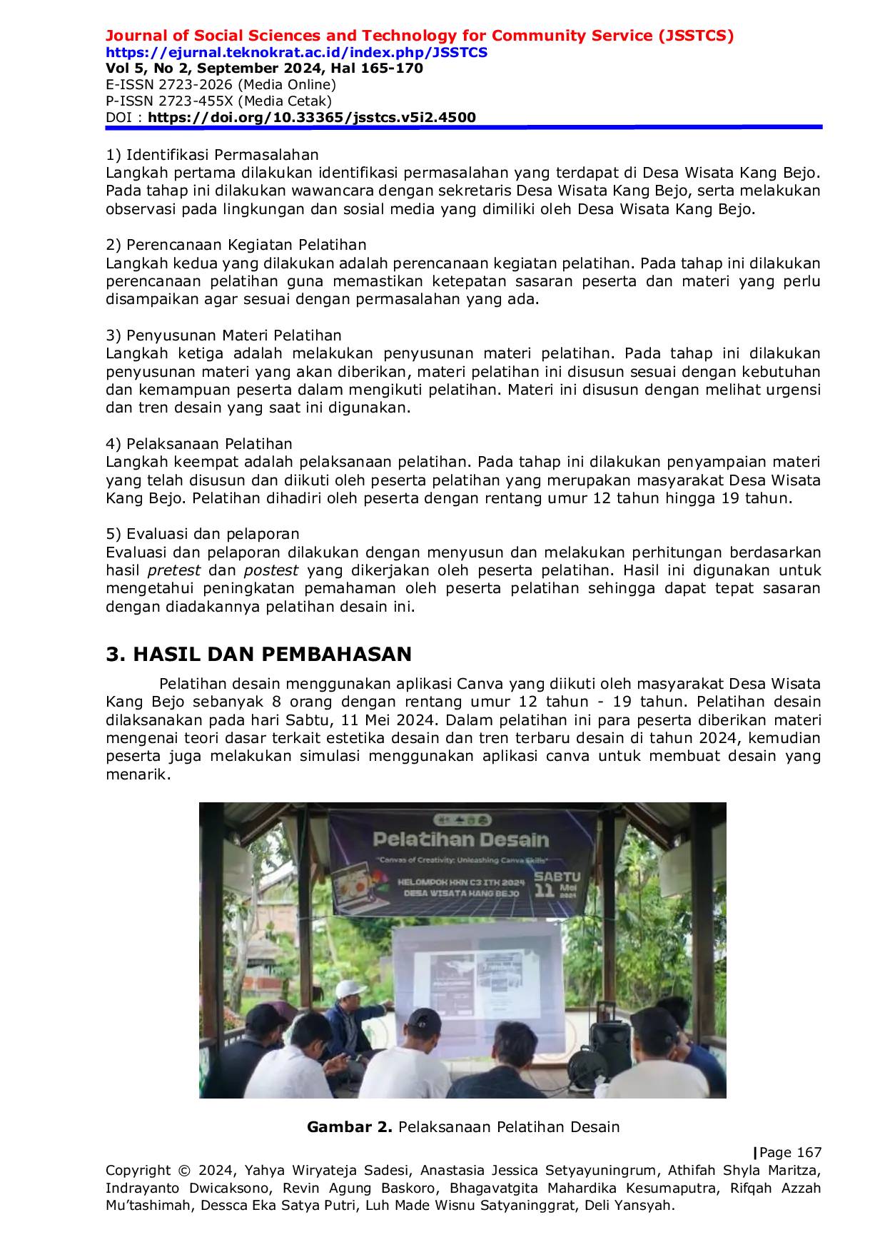 Pelatihan desain berbasis Canva di Kampung Wisata Kang Bejo telah berjalan dengan baik dan meningkatkan pemahaman peserta sebesar 25,40%.Peningkatan tersebut menunjukkan bahwa pelatihan efektif dalam memperkuat pengetahuan teoritis dan praktik desain grafis peserta.Ke depannya, diharapkan peserta dapat terus mengembangkan keterampilan desain mereka sehingga kualitas promosi dan produk desa semakin baik dan berkelanjutan.