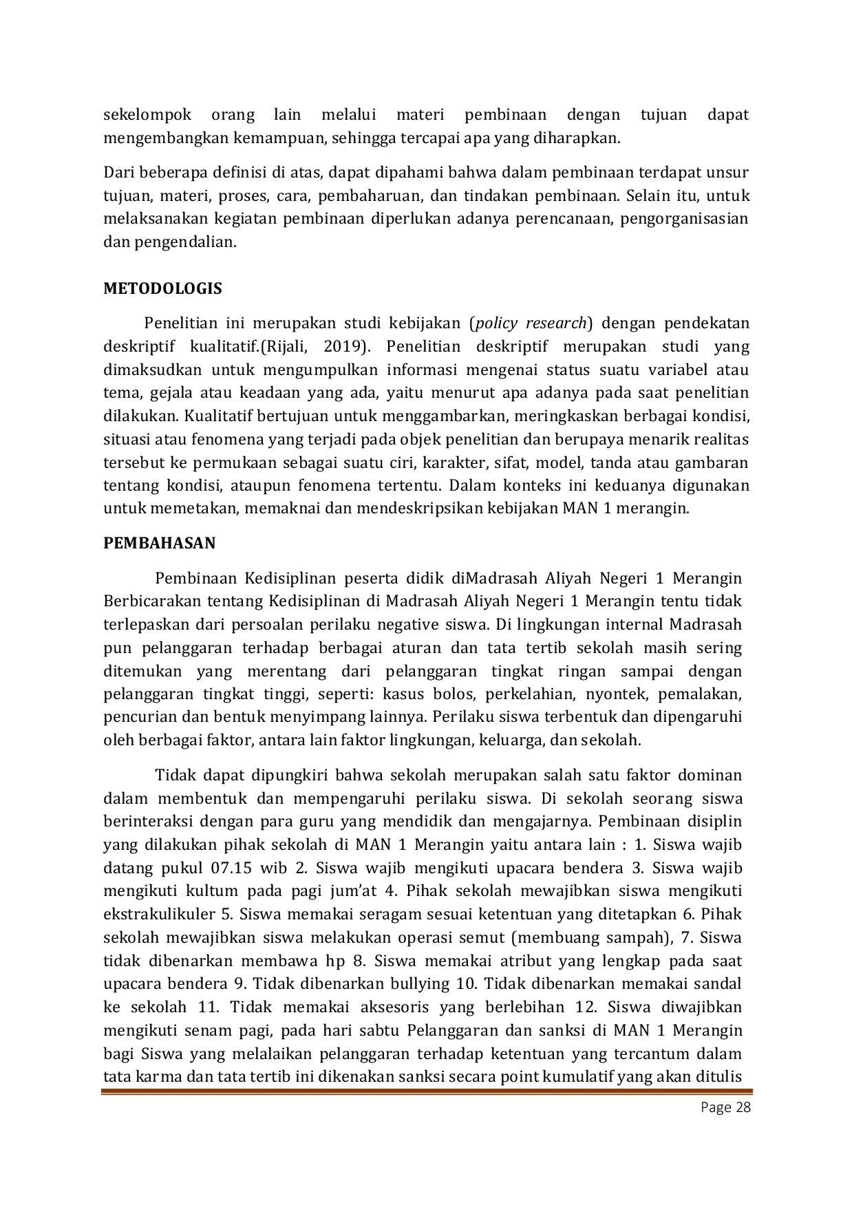 Pembinaan disiplin peserta didik di Madrasah Aliyah Negeri 1 Merangin dilakukan melalui berbagai upaya, termasuk guru menjadi contoh tauladan, membantu siswa mengembangkan pola perilaku, memberlakukan tata tertib yang jelas, dan menjalin komunikasi interaktif dengan orang tua.Faktor-faktor penghambat kedisiplinan meliputi faktor internal seperti kurangnya minat belajar siswa dan faktor eksternal seperti pengaruh lingkungan keluarga dan masyarakat.Dengan demikian, pembinaan kedisiplinan memerlukan kerjasama dari berbagai pihak untuk menciptakan lingkungan belajar yang kondusif dan membentuk karakter siswa yang disiplin.
