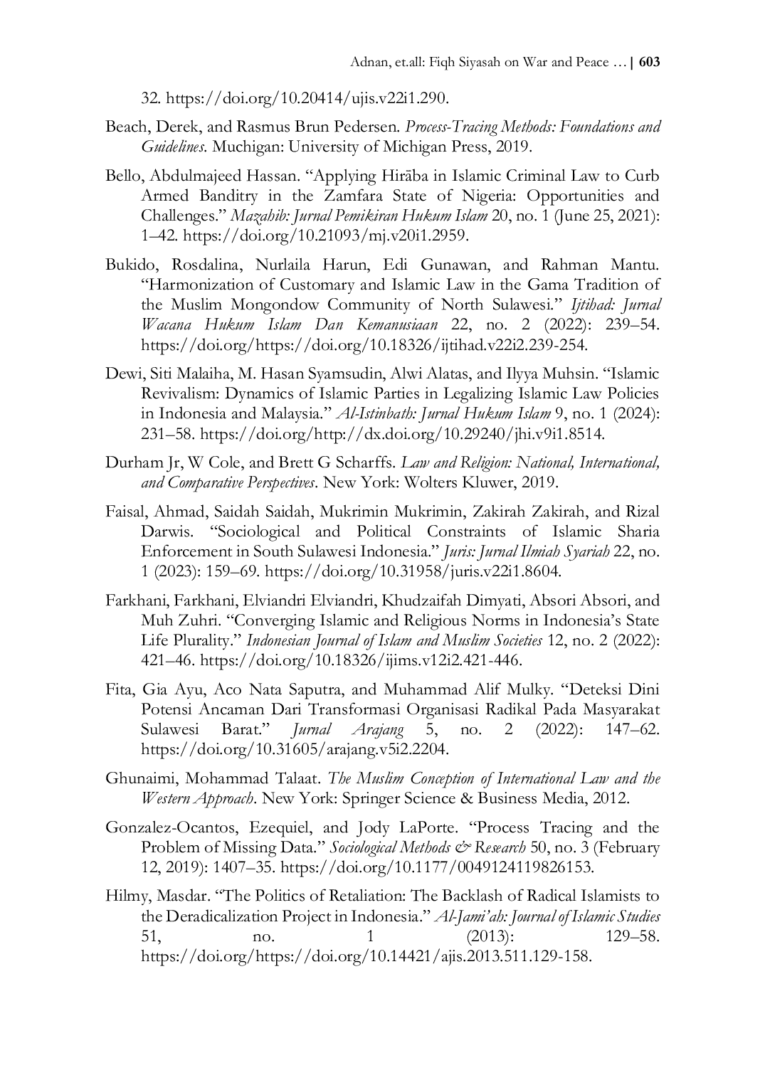Gerakan Islamis di Sulawesi menunjukkan interpretasi bervariasi terhadap Fiqh Siyasa terkait perang dan perdamaian, terbentuk dari konteks ideologis dan sejarah mereka.Interpretasi ini menghasilkan penerapan yang terfragmentasi, mencerminkan tantangan memadukan hukum Islam klasik dengan keragaman konstitusional Indonesia.Penelitian ini menunjukkan perluasan adaptasi Fiqh Siyasa yang kontekstual dan inovatif untuk menjawab isu kontemporer, sambil menjaga prinsip pluralisme dalam kerangka hukum nasional.