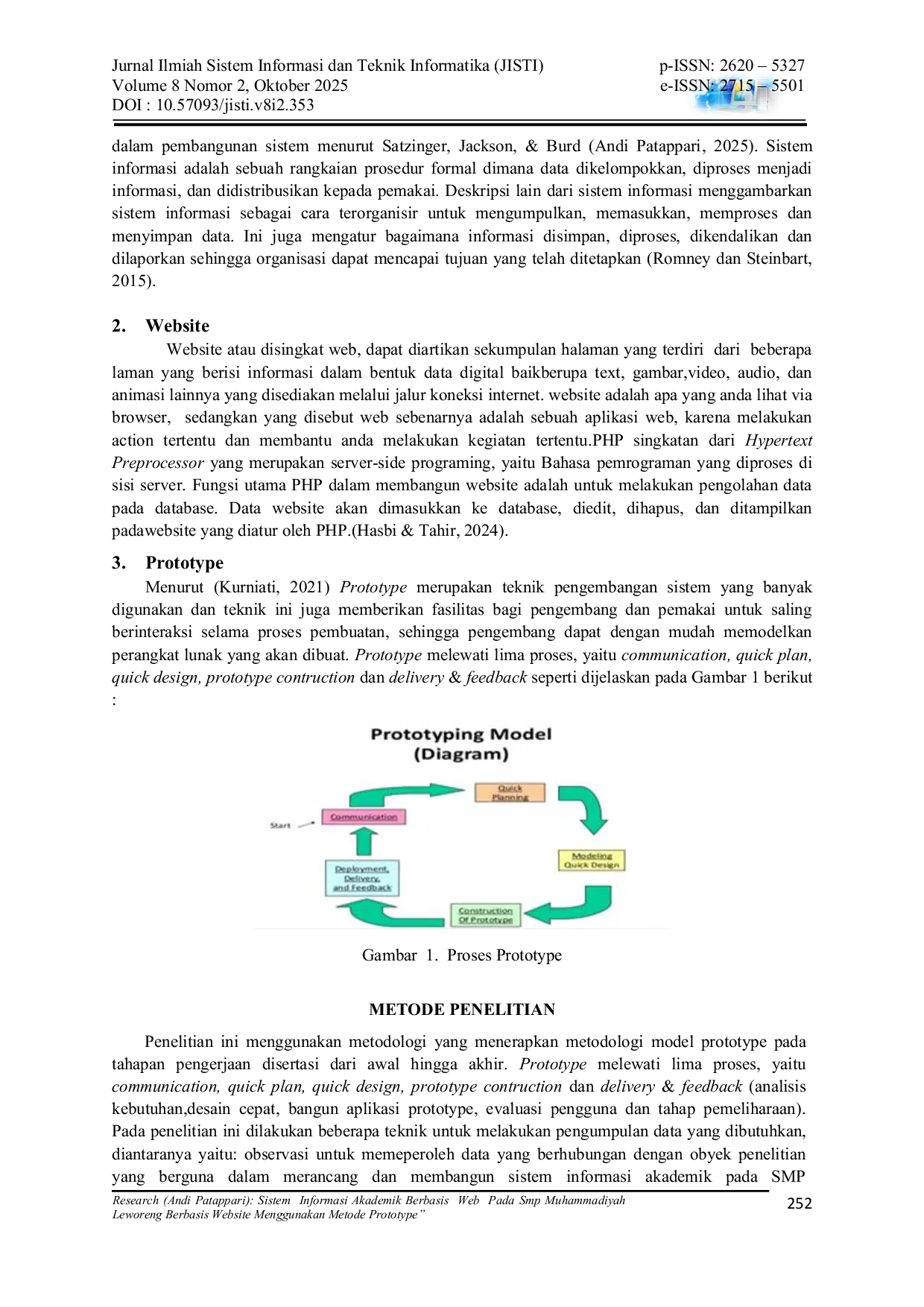 Jurnal Ilmiah Sistem Informasi dan Teknik Informatika (JISTI)Jurnal Ilmiah Sistem Informasi dan Teknik Informatika (JISTI)Penelitian ini bertujuan untuk merancang dan mengimplementasikan sistem informasi akademik berbasis web pada SMP Muhammadiyah Leworeng dengan menggunakan metode prototype. Sistem informasi akademik yang berjalan sebelumnya masih bersifat manual, sehingga menyebabkan kendala dalam efisiensi, akurasi, serta aksesibilitas data akademik seperti data guru, siswa, mata pelajaran, dan nilai. Metode prototype digunakan dalam pengembangan sistem ini karena mampu menyesuaikan kebutuhan pengguna melalui proses iteratif, meliputi tahapan identifikasi kebutuhan, perancangan awal, evaluasi pengguna, dan penyempurnaan hingga menghasilkan prototype final. Aplikasi dikembangkan menggunakan framework Flask dengan basis data MySQL dan didukung antarmuka berbasis web yang responsif.