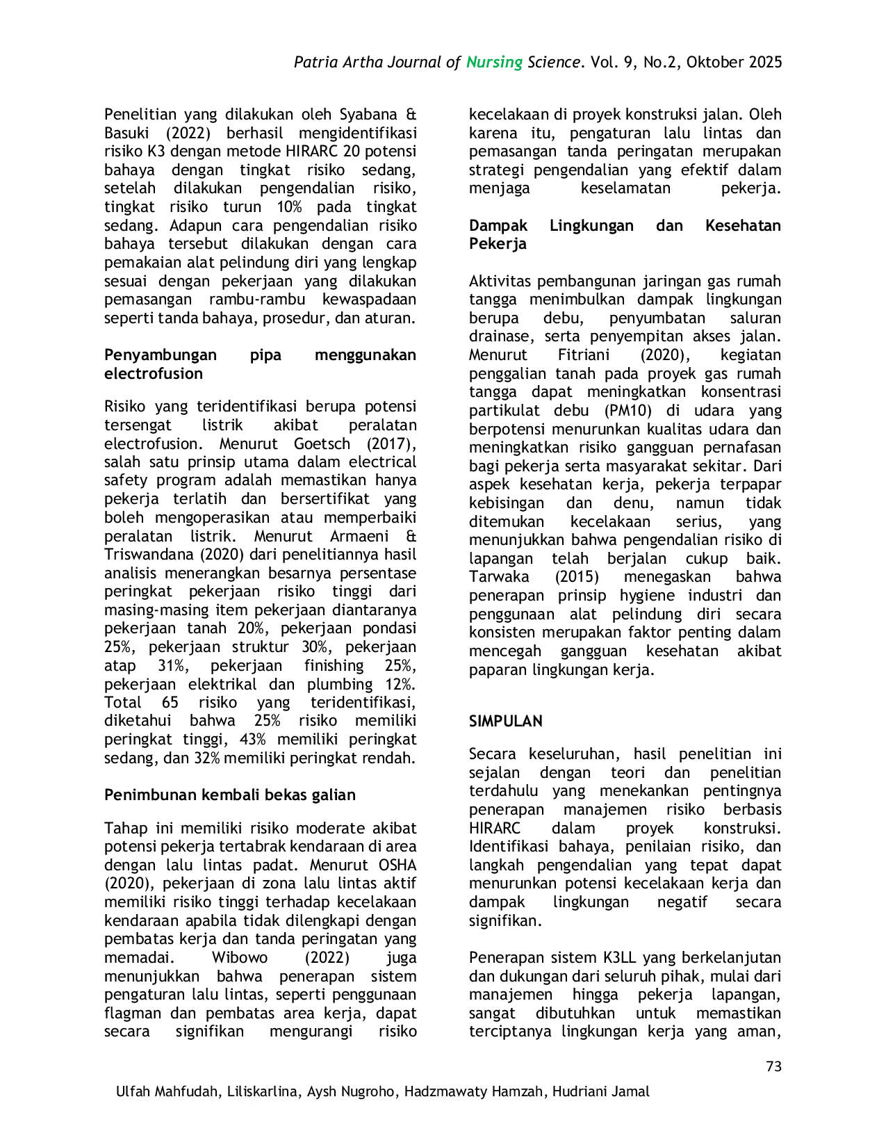 One moment, please...One moment, please...Keselamatan dan Kesehatan Kerja (K3) sangat penting dalam dunia kerja, terutama bagi tenaga kerja konstruksi. Tujuan proyek dapat tercapai dengan baik jika tenaga kerja dijaga sebagai aset penting, sehingga perusahaan harus memastikan keamanan mereka. Manajemen risiko yang efektif diperlukan untuk mengurangi atau mencegah kecelakaan kerja, meminimalkan dampak pada semua aktivitas di tempat kerja. Penelitian ini bertujuan untuk mengetahui penerapan K3LL menggunakan metode HIRARC terhadap dampak lingkungan, kesehatan, dan keselamatan kerja pekerja pada proyek pembangunan jaringan pipa gas rumah tangga, pelanggan kecil, dan komersial. Hasil analisis risiko menunjukkan bahwa pada penggalian tanah/aspal menggunakan cangkul terdapat 1 risiko kategori moderate dan 1 risiko kategori low, pada penggalian menggunakan jack hammer terdapat 1 risiko kategori low karena hasil pengukuran tidak melebihi batas maksimum kebisingan 85 dB, pada penjajaran pipa terdapat 1 risiko moderate dan 1 kategori low, proses memasukkan pipa termasuk kategori low, penyambungan pipa masuk dalam kategori moderate, penimbunan kembali bekas galian termasuk kategori moderate. Pemantauan kondisi fisik lingkungan menunjukkan adanya debu dan bekas tanah galian yang menyumbat saluran drainase, yang dapat memperburuk kondisi lingkungan. Hasil penilaian risiko secara keseluruhan menunjukkan potensi bahaya yang perlu dimitigasi, karena tingkat risiko ini bervariasi. Perusahaan diharapkan dapat terus meningkatkan prosedur kesehatan dan keselamatan kerja, meningkatkan perhatian pada dampak lingkungan yang dapat timbul, dan meningkatkan pelaksanaan K3LL yang berkelanjutan.