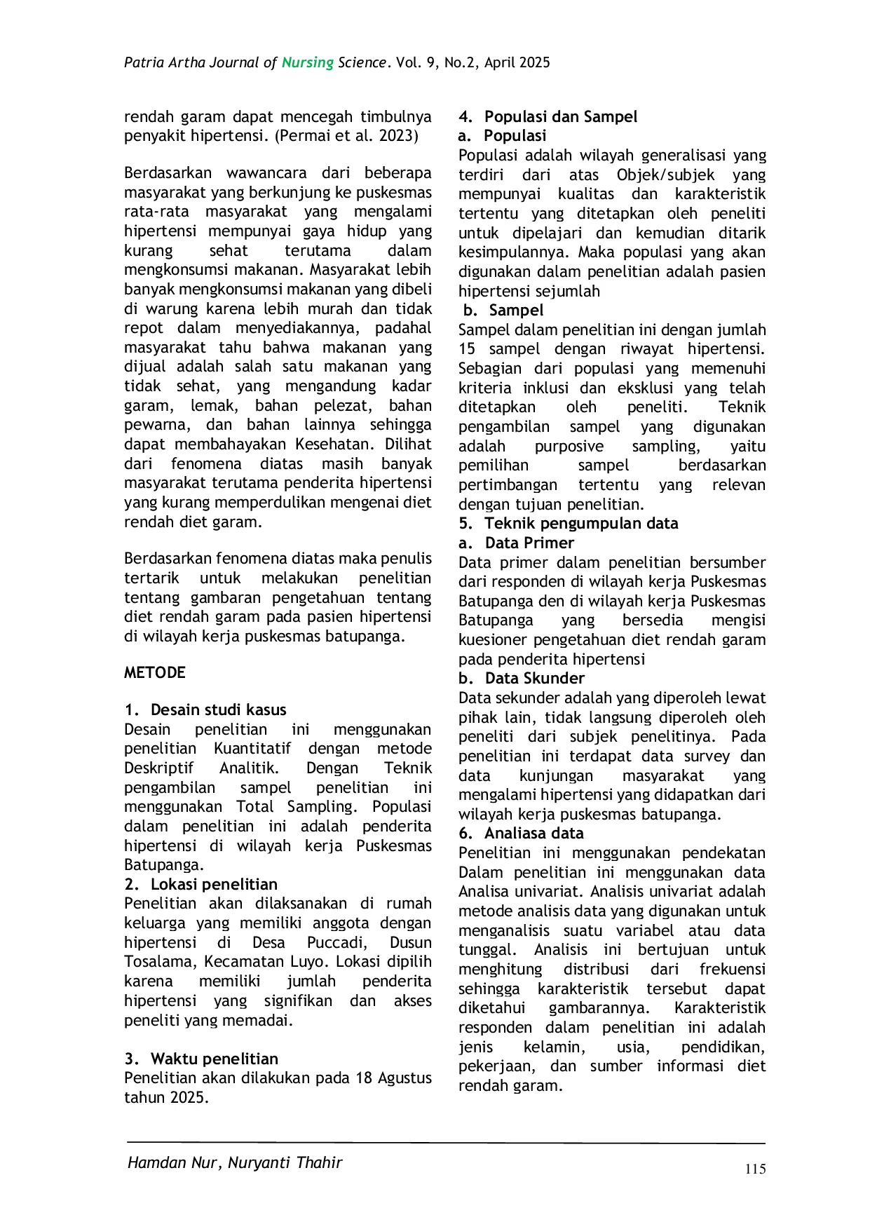 Berdasarkan temuan penelitian, beberapa saran penelitian lanjutan yang dapat dilakukan adalah mengkaji efektivitas berbagai metode edukasi kesehatan dalam meningkatkan kepatuhan diet rendah garam pada pasien hipertensi, misalnya dengan membandingkan metode konseling individu, kelompok, atau penggunaan media visual. Selanjutnya, penelitian dapat difokuskan pada faktor-faktor sosial budaya yang mempengaruhi perilaku konsumsi garam pada masyarakat di wilayah tersebut, seperti peran keluarga, norma sosial, dan ketersediaan makanan rendah garam di pasar tradisional. Terakhir, penting untuk meneliti dampak implementasi diet rendah garam terhadap kualitas hidup pasien hipertensi, termasuk aspek fisik, psikologis, dan sosial, untuk memberikan bukti empiris yang lebih komprehensif mengenai manfaat intervensi ini. Penelitian-penelitian ini diharapkan dapat memberikan informasi yang lebih mendalam dan relevan bagi pengembangan program pengendalian hipertensi yang efektif dan berkelanjutan.