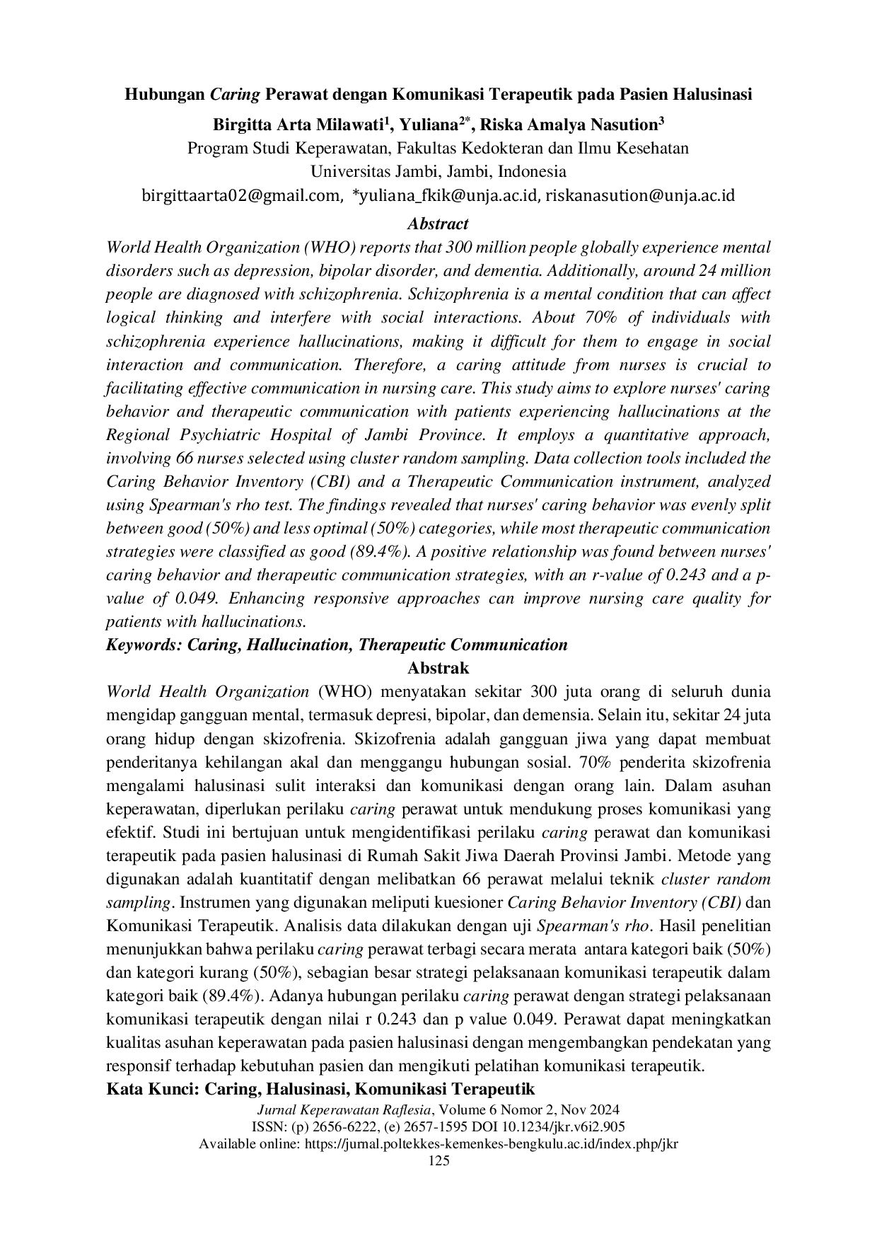 JURNAL KEPERAWATAN RAFLESIAJURNAL KEPERAWATAN RAFLESIAWorld Health Organization (WHO) menyatakan sekitar 300 juta orang di seluruh dunia mengidap gangguan mental, termasuk depresi, bipolar, dan demensia. Selain itu, sekitar 24 juta orang hidup dengan skizofrenia. Skizofrenia adalah gangguan jiwa yang dapat membuat penderitanya kehilangan akal dan menggangu hubungan sosial. 70% penderita skizofrenia mengalami halusinasi sulit interaksi dan komunikasi dengan orang lain. Dalam asuhan keperawatan, diperlukan perilaku caring perawat untuk mendukung proses komunikasi yang efektif. Studi ini bertujuan untuk mengidentifikasi perilaku caring perawat dan komunikasi terapeutik pada pasien halusinasi di Rumah Sakit Jiwa Daerah Provinsi Jambi. Metode yang digunakan adalah kuantitatif dengan melibatkan 66 perawat melalui teknik cluster random sampling. Instrumen yang digunakan meliputi kuesioner Caring Behavior Inventory (CBI) dan Komunikasi Terapeutik. Analisis data dilakukan dengan uji Spearmans rho. Hasil penelitian menunjukkan bahwa perilaku caring perawat terbagi secara merata antara kategori baik (50%) dan kurang (50%), sebagian besar strategi pelaksanaan komunikasi terapeutik termasuk kategori baik (89,4%). Terdapat hubungan positif antara perilaku caring perawat dengan strategi pelaksanaan komunikasi terapeutik (r = 0,243, p = 0,049). Perawat dapat meningkatkan kualitas asuhan keperawatan pada pasien halusinasi dengan mengembangkan pendekatan yang responsif terhadap kebutuhan pasien dan mengikuti pelatihan komunikasi terapeutik.