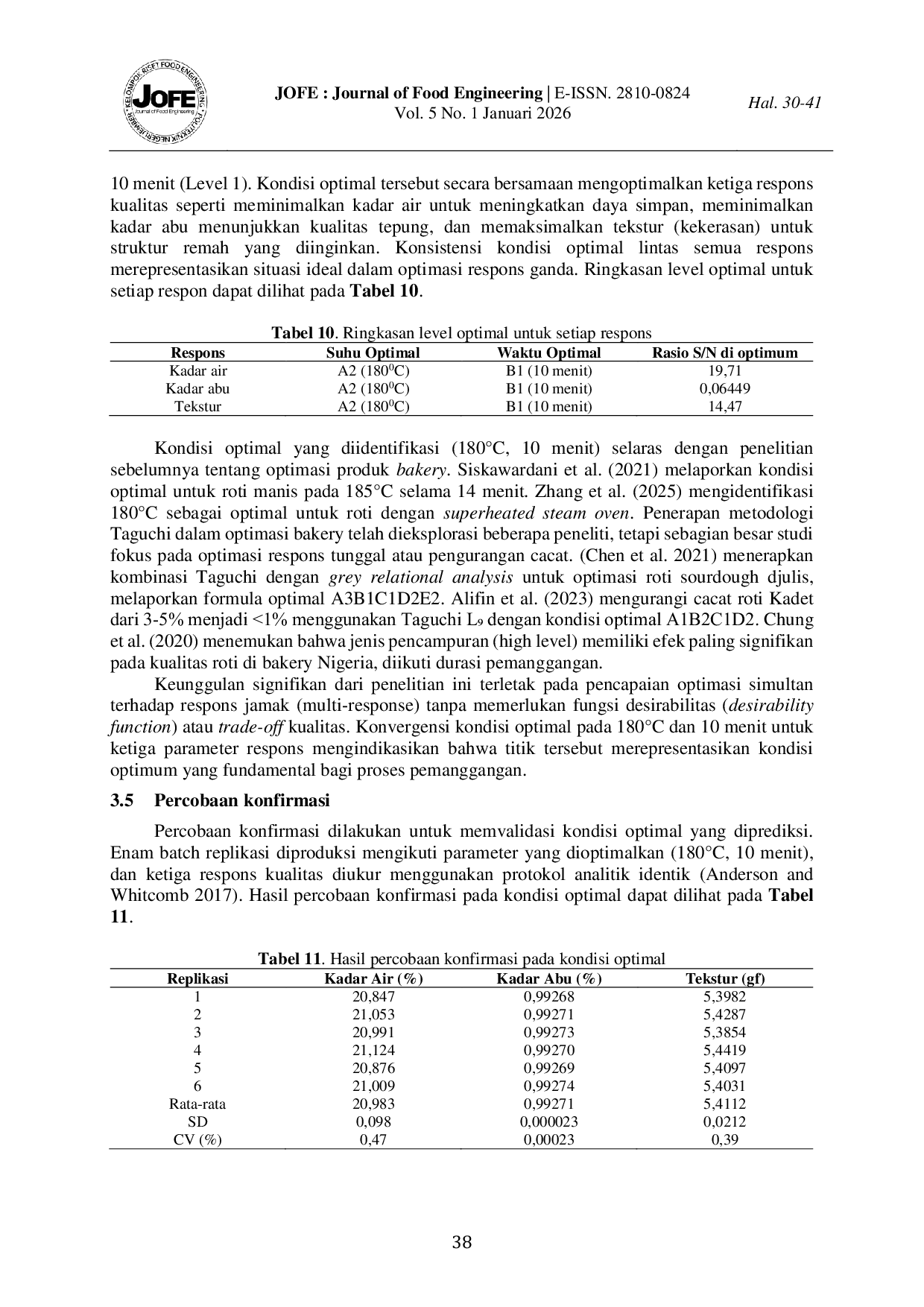 Journal of Food EngineeringJournal of Food EngineeringIndustri pangan skala kecil dan menengah (UKM) seringkali menghadapi kendala dalam menjaga konsistensi mutu produk. Hal tersebut disebabkan karena belum adanya sistem optimasi proses yang terstandar. Penelitian ini bertujuan untuk mengatasi masalah tersebut dengan menerapkan metode Taguchi L9(32) guna mengoptimalkan parameter proses pemanggangan roti manis secara efisien. Fokus penelitian ini terdiri dari dua faktor, yaitu suhu pemanggangan (1600C, 1800C, 2000C) dan waktu pemanggangan (10, 15, 20 menit). Respons yang diamati antara lain kadar air, kadar abu, dan tekstur. Berdasarkan hasil analisis rasio Signal-to-Noise (S/N) dan ANOVA, ditemukan bahwa parameter pemanggangan roti manis yang optimal tercapai pada suhu 1800C selama 10 menit. Hasil statistik menunjukkan bahwa waktu pemanggangan memberikan kontribusi dominan (55,9%) terhadap variabilitas kadar air, dan tekstur (79,1%). Sedangkan kadar abu sangat dipengaruhi oleh variabel suhu (74,1%). Validasi eksperimen menunjukkan hasil akurasi yang tinggi dengan margin kesalahan di bawah 2% dan stabilitas protokol yang sangat baik. Implementasi proses pemanggangan roti manis yang optimal ini mampu menekan angka kecacatan produk menjadi 1,2% dan mengurangi konsumsi energi sebesar 12%. Efektivitas desain eksperimen untuk standarisasi mutu sangat menentukan tingkat dan peningkatan produktivitas pada operasional UKM pangan.