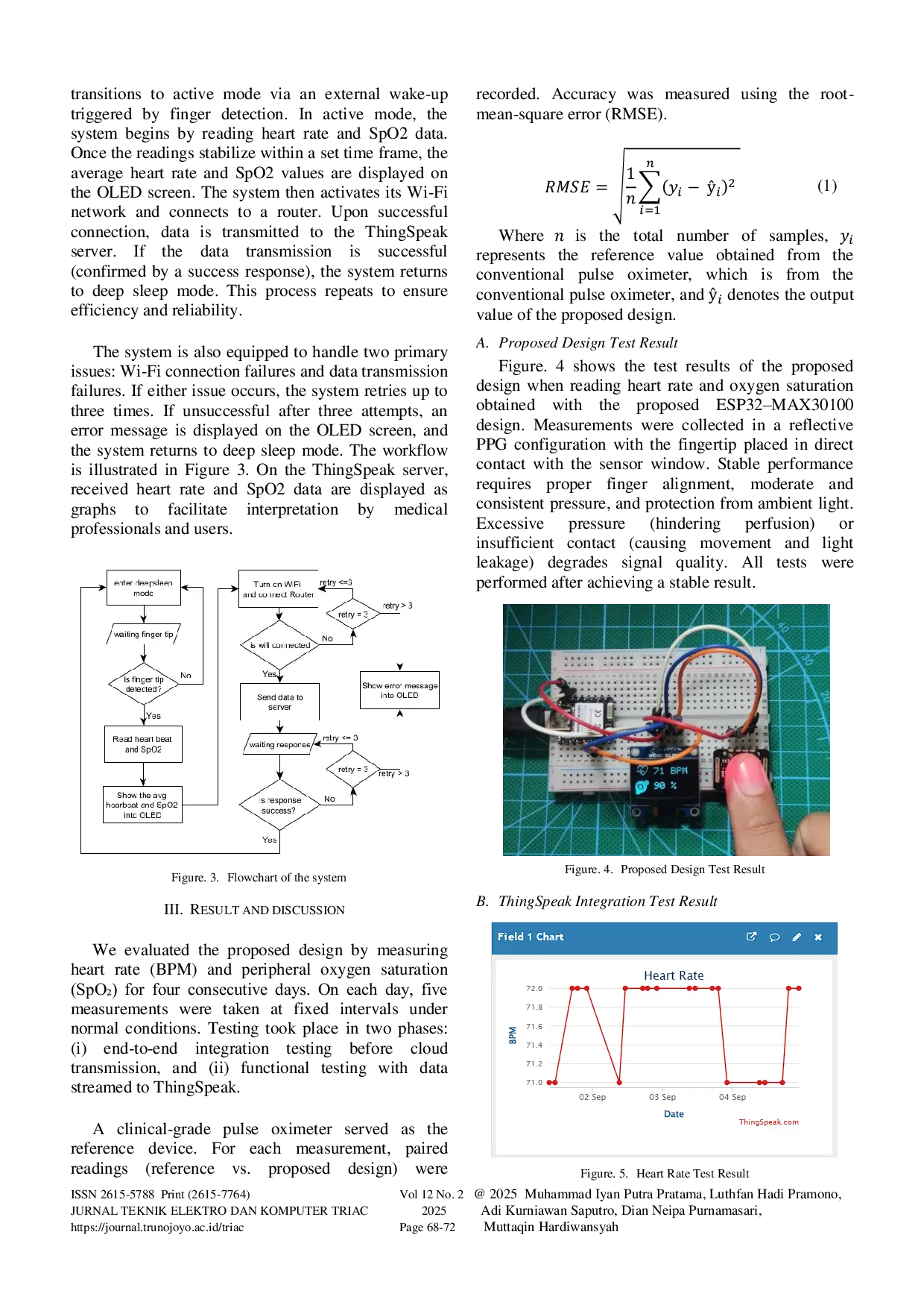 Jurnal Teknik Elektro dan Komputer TRIACJurnal Teknik Elektro dan Komputer TRIACCardiovascular disease (CVD) motivates affordable, continuous monitoring of heart rate and peripheral oxygen saturation (SpO₂). We present a single-MCU device using ESP32 and MAX30102 photoplethysmography sensor that acquires heart rate and SpO₂ and streams data to a ThingSpeak dashboard. Performance was evaluated over four consecutive days under normal conditions, with five paired measurements per day against a clinically approved fingertip oximeter. Using all paired observations, the proposed design achieved low errors with RMSE = 0.84 bpm for heart rate and 0.59 percentage points for SpO₂, the maximum absolute error did not exceed 1 bpm or 1 pp, respectively. These results demonstrate end-to-end operation and good agreement with reference in resting conditions.