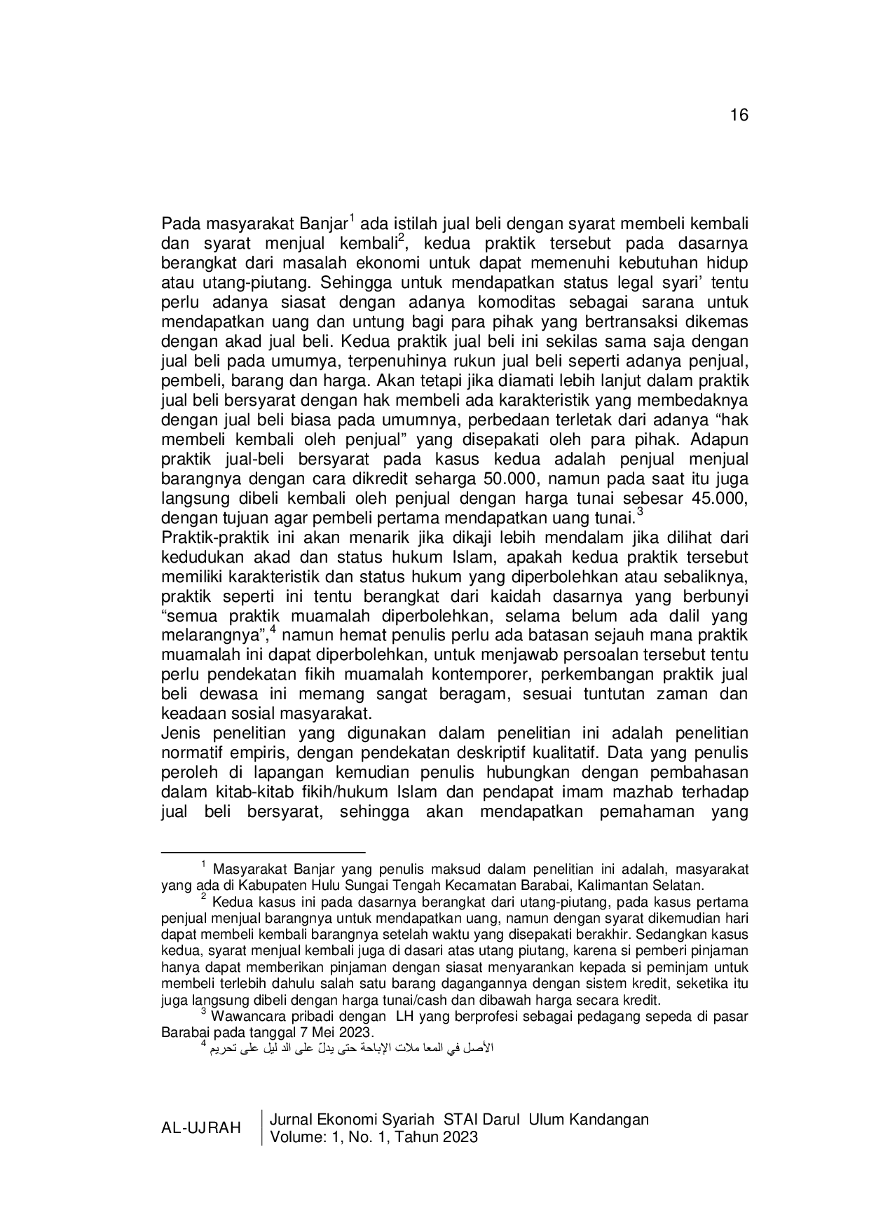 Al-Ujrah | Jurnal Ekonomi SyariahAl-Ujrah | Jurnal Ekonomi SyariahTulisan akademik penulis mengenai keberagaman praktik jual beli dengan adanya tambahan syarat yang dilakukan oleh sebagian masyarakat. Munculnya praktik jual beli bersyarat didasari atas utang-piutang, namun untuk dapat menghindari praktik yang dilarang dalam Islam, oleh sebab itulah dilakukan siasat hukum. Ada dua praktik bersyarat yang penulis sajikan, pertama praktik jual beli bersyarat dalam hal ini penjual mempunyai hak untuk dapat membeli kembali barangnya dari pembeli berdasarkan waktu yang telah disepakati bersama. Kedua praktik jual beli bersyarat dengan siasat menjual kembali dengan harga tunai namun dibawah pada harga jual beli yang dilakukan dengan sistem kredit. Jenis penelitian ini adalah penelitian normatif empiris, dengan pendekatan deskriptif kualitatif. Hasil dalam penelitian ini jika ditinjau dari rukun akad jual beli maka dapat dikatakan sudah terpenuhi. Pada kasus pertama praktik tersebut hemat penulis murni dilakukan dengan melahirkan asas kemaslahatan bagi para pihak, tercermin dari para pihak yang melakukan transaksi tidak ada yang dirugikan. Namun pada kasus praktik jual beli yang kedua tidak mencerminkan adanya kemaslahatan, karena siasat dalam praktik ini sangat jelas memanfaatkan keadaan orang lain untuk mendapatkan keuntungan.