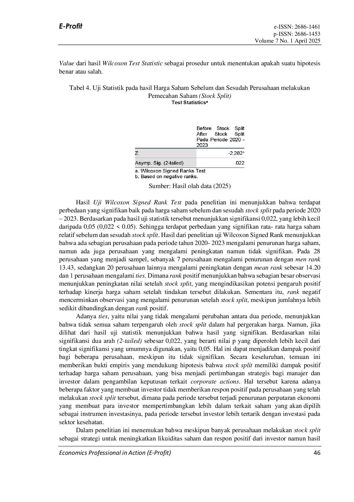 Economics Professional in Action (E-Profit)Economics Professional in Action (E-Profit)Penelitian ini bertujuan untuk menganalisis perbedaan harga saham sebelum dan sesudah peristiwa stock split, serta untuk mengevaluasi respons pasar terhadap perubahan tersebut. Penelitian ini menggunakan pendekatan komparatif. Pengamatan dilakukan selama periode jendela 3 hari sebelum dan 3 hari sesudah pemecahan saham pada perusahaan - perusahaan yang terdaftar di Bursa Efek Indonesia (BEI) periode 2020 – 2023. Data diperoleh dari sumber terpercaya seperti BEI dan Investing.com yang telah diverifikasi. Hasil penelitian menunjukkan bahwa dari 28 perusahaan yang dianalisis, 20 perusahaan mengalami respons positif, 7 perusahaan mengalami respons negatif, dan 1 perusahaan tidak menunjukkan perubahan signifikan setelah stock split. Respons positif umumnya terjadi pada perusahaan di sektor yang mengalami peningkatan permintaan selama pandemi, seperti sektor kesehatan. Kesimpulannya, dampak stock split bervariasi tergantung pada sektor industri, di mana sektor tertentu seperti kesehatan menunjukkan respons pasar yang lebih menguntungkan selama pandemi.