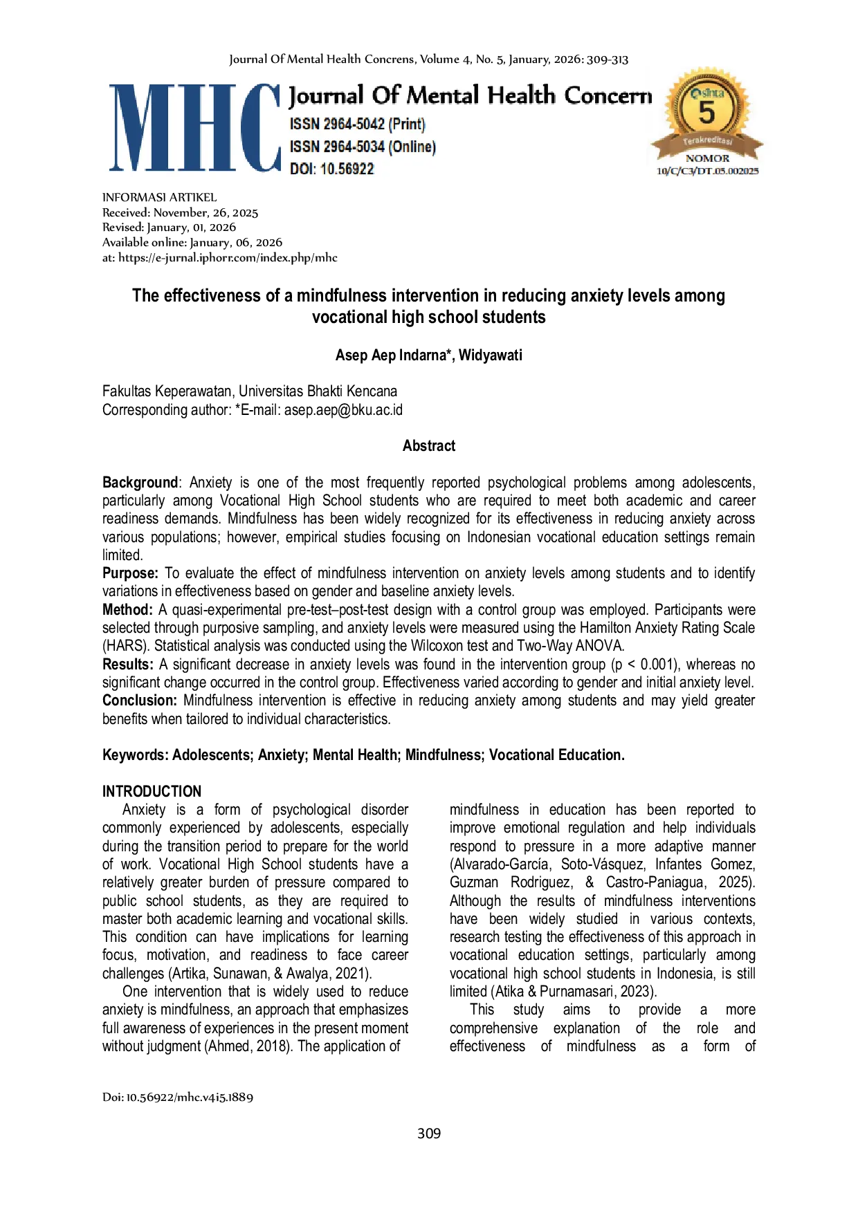 JOURNAL OF Mental Health ConcernsJOURNAL OF Mental Health ConcernsAnxiety adalah salah satu masalah psikologis yang paling sering dilaporkan di kalangan remaja, terutama di kalangan siswa Sekolah Menengah Kejuruan yang harus memenuhi tuntutan akademik dan kesiapan karir. Mindfulness telah diakui secara luas karena efektifitasnya dalam mengurangi kecemasan di berbagai populasi; namun, studi empiris yang berfokus pada pengaturan pendidikan kejuruan di Indonesia masih terbatas. Tujuan penelitian ini adalah untuk mengevaluasi efek intervensi mindfulness terhadap tingkat kecemasan siswa dan mengidentifikasi variasi efektivitas berdasarkan jenis kelamin dan tingkat kecemasan awal.