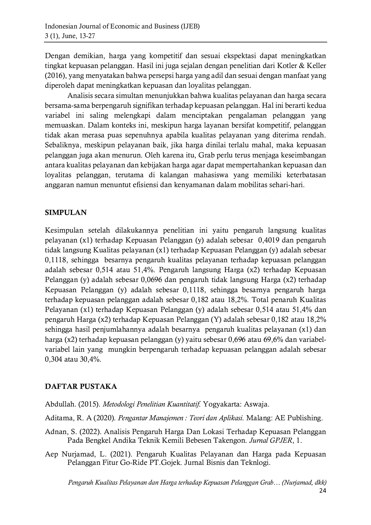 Penelitian menunjukkan bahwa kualitas pelayanan secara langsung memberikan kontribusi 51,4% terhadap kepuasan pelanggan, sedangkan harga memberikan kontribusi 18,2%.secara gabungan kedua faktor tersebut menjelaskan 69,6% variasi kepuasan pelanggan, sementara faktor lain menyumbang 30,4% sisanya.Nilai koefisien langsung dan tidak langsung masing‑masing untuk kualitas pelayanan (0,4019 dan 0,1118) serta harga (0,0696 dan 0,1118) memperkuat temuan tersebut.Dengan demikian, peningkatan kualitas pelayanan dan penetapan harga yang kompetitif merupakan strategi utama untuk meningkatkan kepuasan pengguna Grab di kalangan mahasiswa.