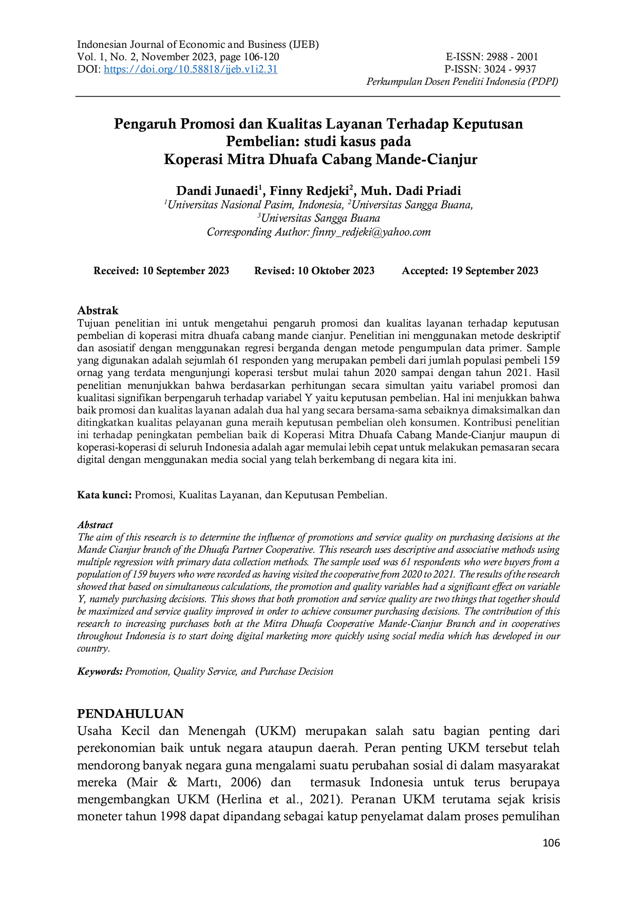 - Pengaruh Promosi dan Kualitas Layanan Terhadap Keputusan Pembelian: studi kasus pada Koperasi Mitra Dhuafa... jurnal.pdpi.or.id/index.php/ijeb/article/view/31Pengaruh Promosi dan Kualitas Layanan Terhadap Keputusan Pembelian studi kasus pada Koperasi Mitra Dhuafa jurnal pdpi index php ijeb article view 31