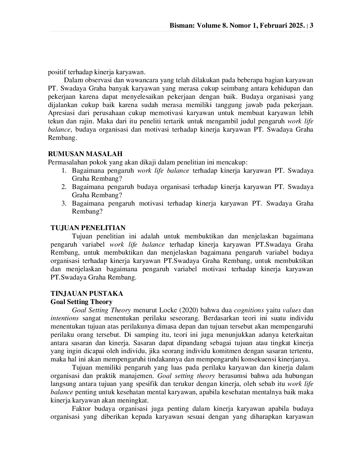 Bisman (Bisnis dan Manajemen): The Journal of Business and ManagementBisman (Bisnis dan Manajemen): The Journal of Business and ManagementKinerja karyawan sangat penting untuk mencapai ekonomi berbasis pengetahuan dan persaingan. Perusahaan dapat meningkatkan kinerja karyawan dengan memperkuat work life balance, budaya organisasi, dan meningkatkan motivasi. Penelitian ini bertujuan untuk memperoleh bukti dan analisis korelasi antara work life balance, budaya organisasi, dan motivasi terhadap kinerja karyawan. Teknik pengumpulan data yang digunakan adalah metode angket. Metode pengujian data menggunakan uji reliabilitas dan validitas, sedangkan teknik analisis data menggunakan analisis regresi linier berganda menggunakan uji R². Hasil penelitian menunjukkan bahwa work life balance berpengaruh positif signifikan terhadap kinerja, budaya organisasi berpengaruh positif signifikan terhadap kinerja, dan motivasi berpengaruh positif tidak signifikan terhadap kinerja. Variabel work life balance, budaya organisasi, dan motivasi dapat menjelaskan terhadap kinerja karyawan sebesar 20,1 %.