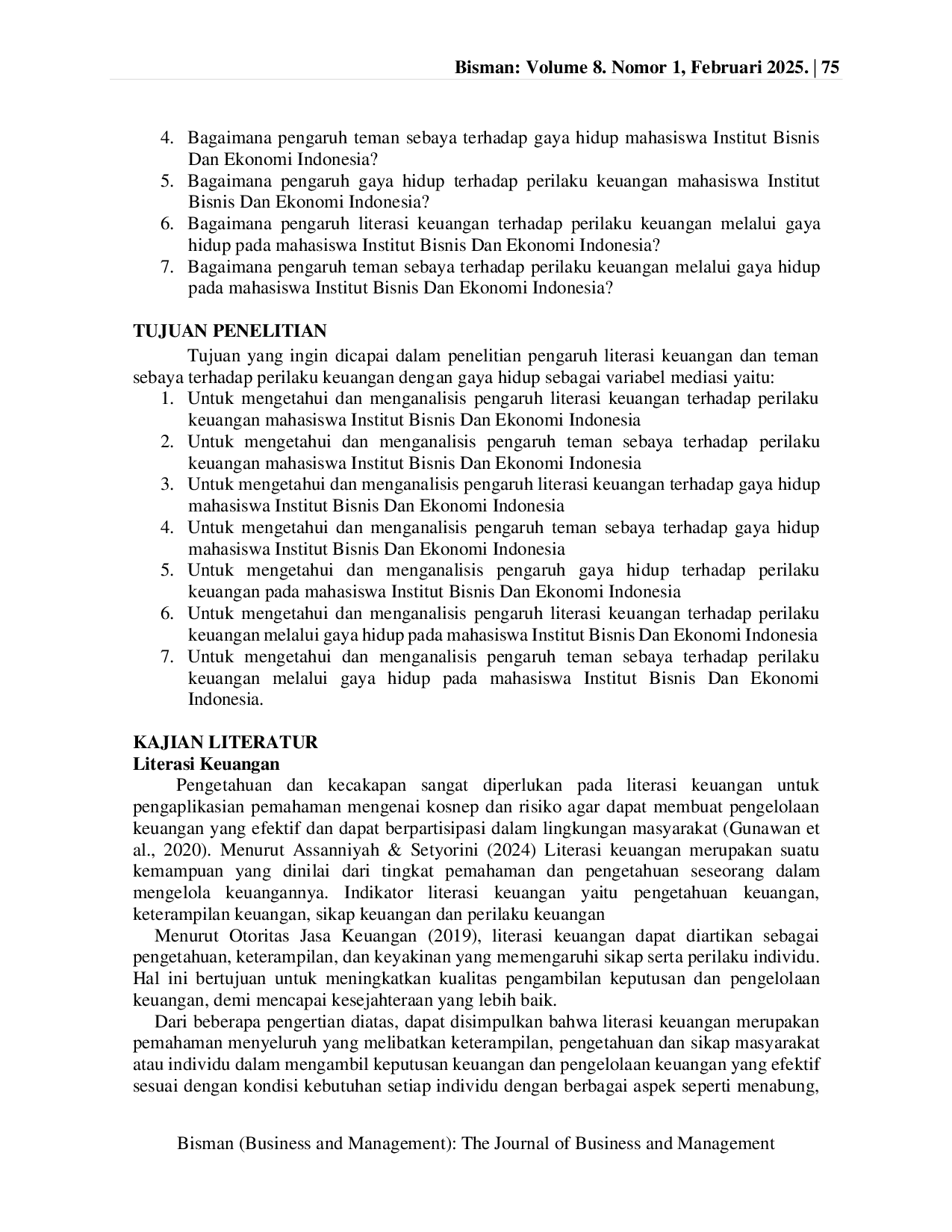 Bisman (Bisnis dan Manajemen): The Journal of Business and ManagementBisman (Bisnis dan Manajemen): The Journal of Business and ManagementPenelitian ini bertujuan untuk menganalisis dan mengetahui adanya pengaruh literasi keuangan dan teman sebaya terhadap perilaku keuangan dengan gaya hidup sebagai variabel mediasi (Studi pada mahasiswa Institut Bisnis dan Ekonomi Indonesia). Populasi penelitian ini adalah 821 mahasiswa IBE Indonesia angkatan 2021-2024, teknik pengambilan sampel menggunakan purposive sampling dan rumus sampel yaitu Taro Yamane dengan tingkat erorr 5%, di peroleh sampel sebanyak 268 responden. Teknik pengumpulan data menggunakan kuesioner dari google form dan alat analisis data menggunakan Smart PLS 4.0. Teknik analisis data menggunakan PLS-SEM. Berdasarkan hasil penelitian ini, dapat disimpulkan bahwa literasi keuangan memiliki pengaruh positif terhadap perilaku keuangan. Selain itu, keberadaan variabel teman sebaya juga memberikan dampak positif signifikan terhadap perilaku keuangan. Literasi keuangan dan teman sebaya juga berkontribusi secara positif dan signifikan terhadap gaya hidup. Terakhir, gaya hidup berperan dalam memediasi hubungan antara literasi keuangan dan perilaku keuangan, serta antara teman sebaya dan perilaku keuangan.