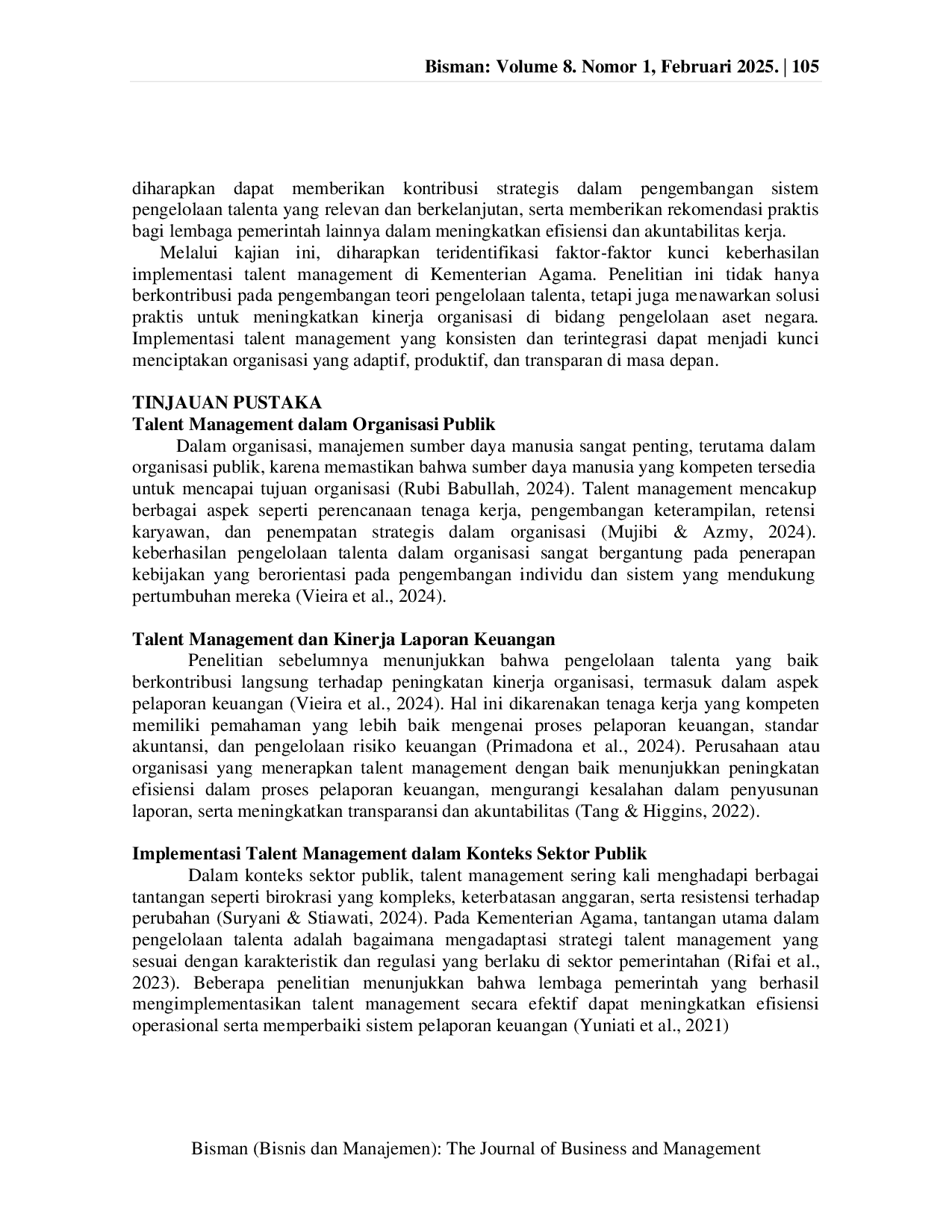 Bisman (Bisnis dan Manajemen): The Journal of Business and ManagementBisman (Bisnis dan Manajemen): The Journal of Business and ManagementPenelitian ini bertujuan untuk menganalisis pengaruh implementasi talent management terhadap kinerja laporan keuangan dalam penatausahaan aset negara di Kementerian Agama. Dengan pendekatan kuantitatif, penelitian ini mengeksplorasi hubungan antara variabel independen, yaitu talent management yang mencakup perencanaan, pengembangan, dan penempatan talenta, dengan variabel dependen berupa kinerja laporan keuangan yang diukur melalui akurasi, kelengkapan, dan ketepatan waktu. Data diperoleh melalui kuesioner skala Likert dan dokumentasi laporan keuangan, dianalisis menggunakan regresi linier sederhana serta uji-t. Hasil penelitian menunjukkan bahwa implementasi talent management secara signifikan memengaruhi kinerja laporan keuangan, dengan nilai R-squared sebesar 0,72. Hal ini mengindikasikan bahwa 72% variasi kinerja laporan keuangan dijelaskan oleh pengelolaan talenta yang efektif, sementara sisanya dipengaruhi oleh faktor lain. Penelitian ini menegaskan pentingnya pengelolaan talenta yang konsisten dan terintegrasi dalam meningkatkan efisiensi dan akuntabilitas organisasi, khususnya di sektor pengelolaan aset negara.