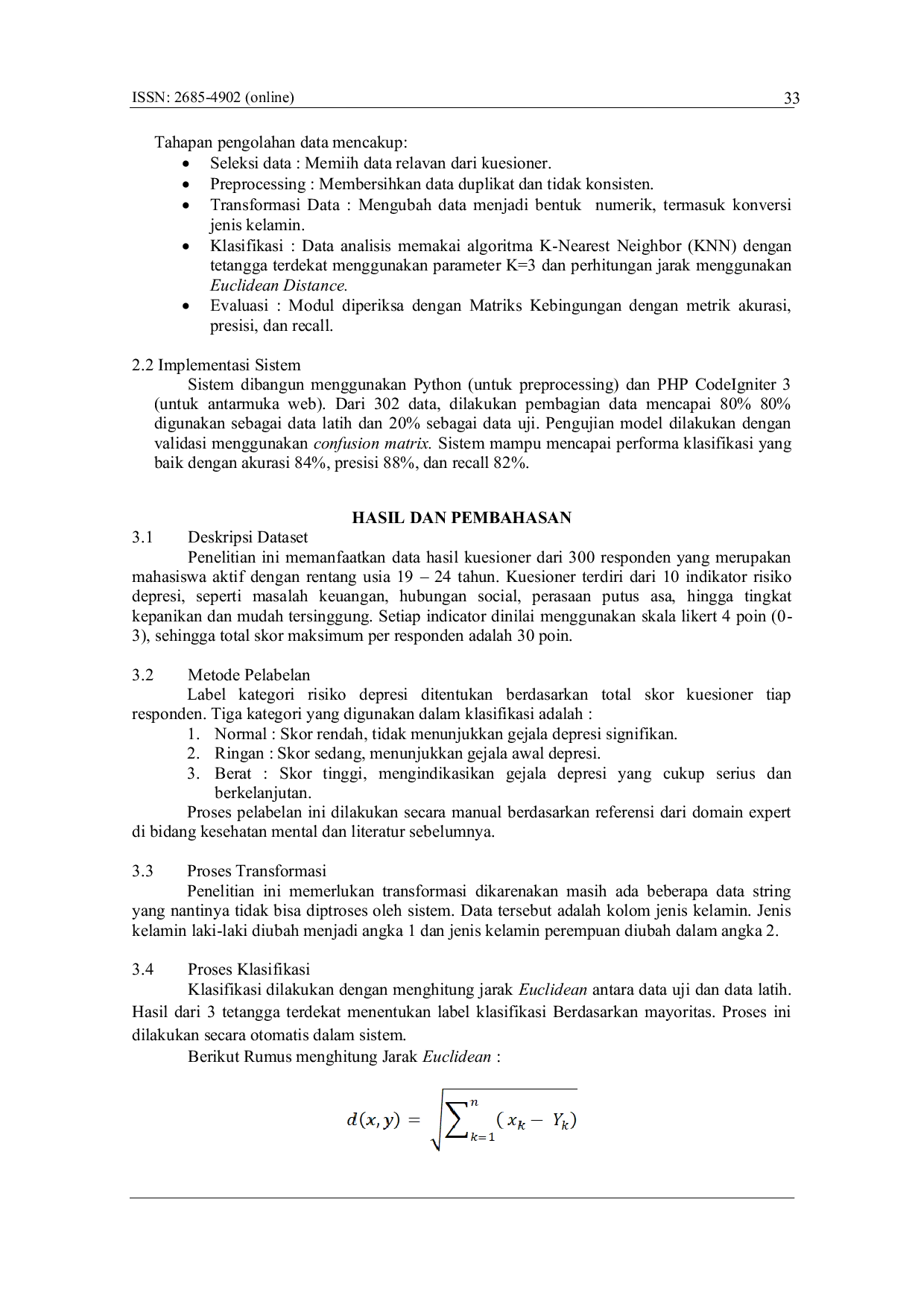 Jurnal Ilmiah Intech : Information Technology Journal of UMUSJurnal Ilmiah Intech : Information Technology Journal of UMUSMahasiswa sering mengalami tekanan dari aspek akademik, sosial, dan pribadi yang dapat menyebabkan gangguan mental seperti depresi. Jika tidak ditangani, kondisi ini berisiko mengganggu pencapaian akademik, relasi sosial, hingga memicu tindakan ekstrem. Penelitian ini bertujuan untuk merancang dan mengembangkan sebuah sistem guna memprediksi tingkat risiko depresi pada mahasiswa menggunakan algoritma klasifikasi K-Nearest Neighbor (KNN). Data dikumpulkan dari 300 mahasiswa melalui kuesioner dengan skala Likert. Sistem dikembangkan menggunakan Python untuk tahap pra-pemrosesan. Proses analisis mencakup seleksi data, pembersihan, transformasi, klasifikasi dengan KNN, dan evaluasi kinerja menggunakan confusion matrix. Dari pengujian terhadap 60 data uji, diperoleh akurasi 85%, presisi 90%, dan recall 83%. Sistem ini berpotensi digunakan sebagai alat bantu deteksi dini bagi mahasiswa dan institusi pendidikan.