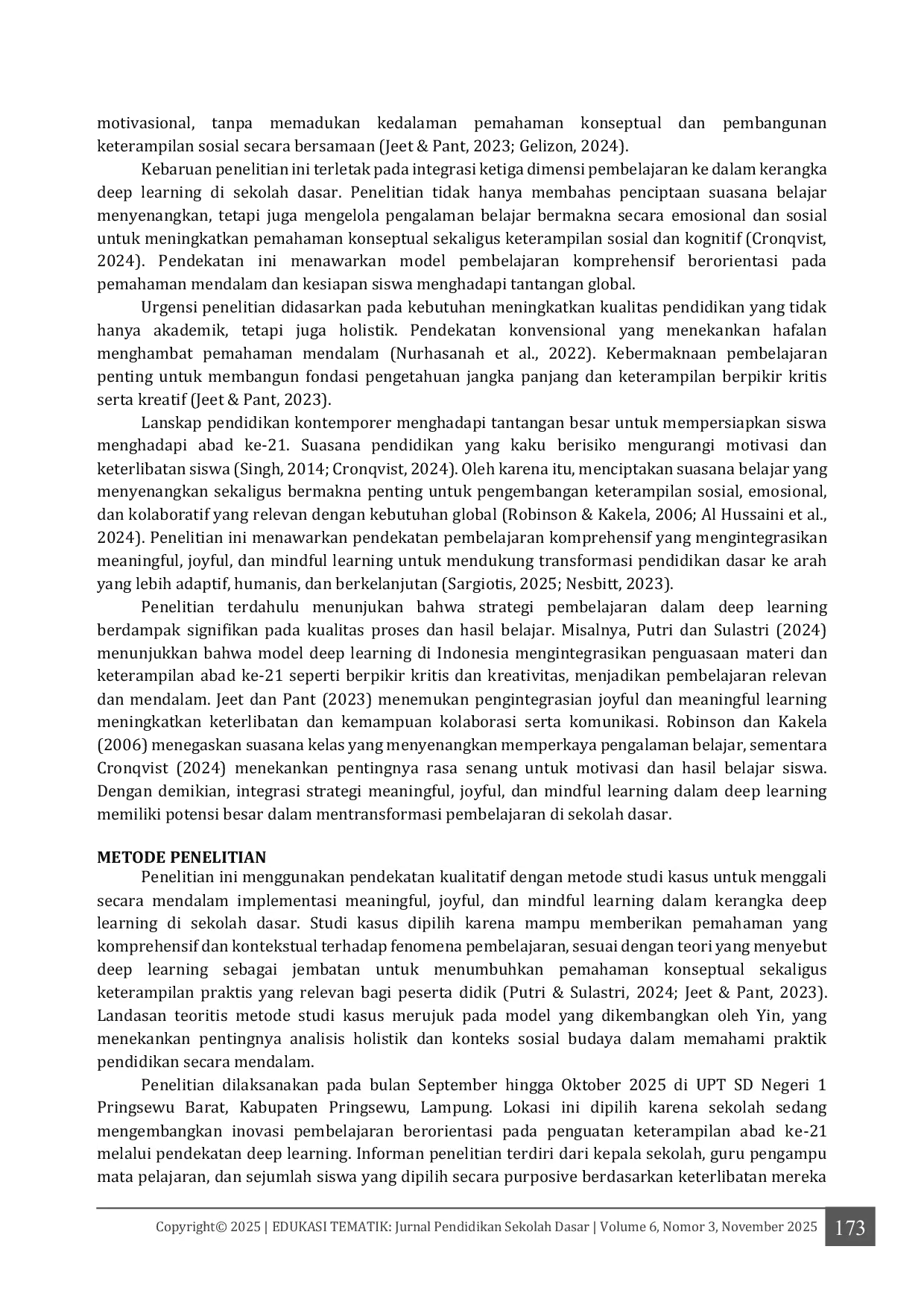 Penelitian ini menyimpulkan bahwa pembelajaran berbasis Deep Learning dengan mengintegrasikan Meaningful, Joyful, dan Mindful Learning mampu meningkatkan kualitas pembelajaran dasar yang lebih adaptif dan humanis.Model ini berhasil menciptakan sistem pembelajaran holistik yang berorientasi pada pengembangan kognitif, afektif, dan sosial-emosional peserta didik.Penelitian ini menyatakan bahwa ketiga dimensi pembelajaran tersebut dapat membekali siswa dengan keterampilan abad ke-21 seperti berpikir kritis, kolaborasi, dan kesadaran diri.