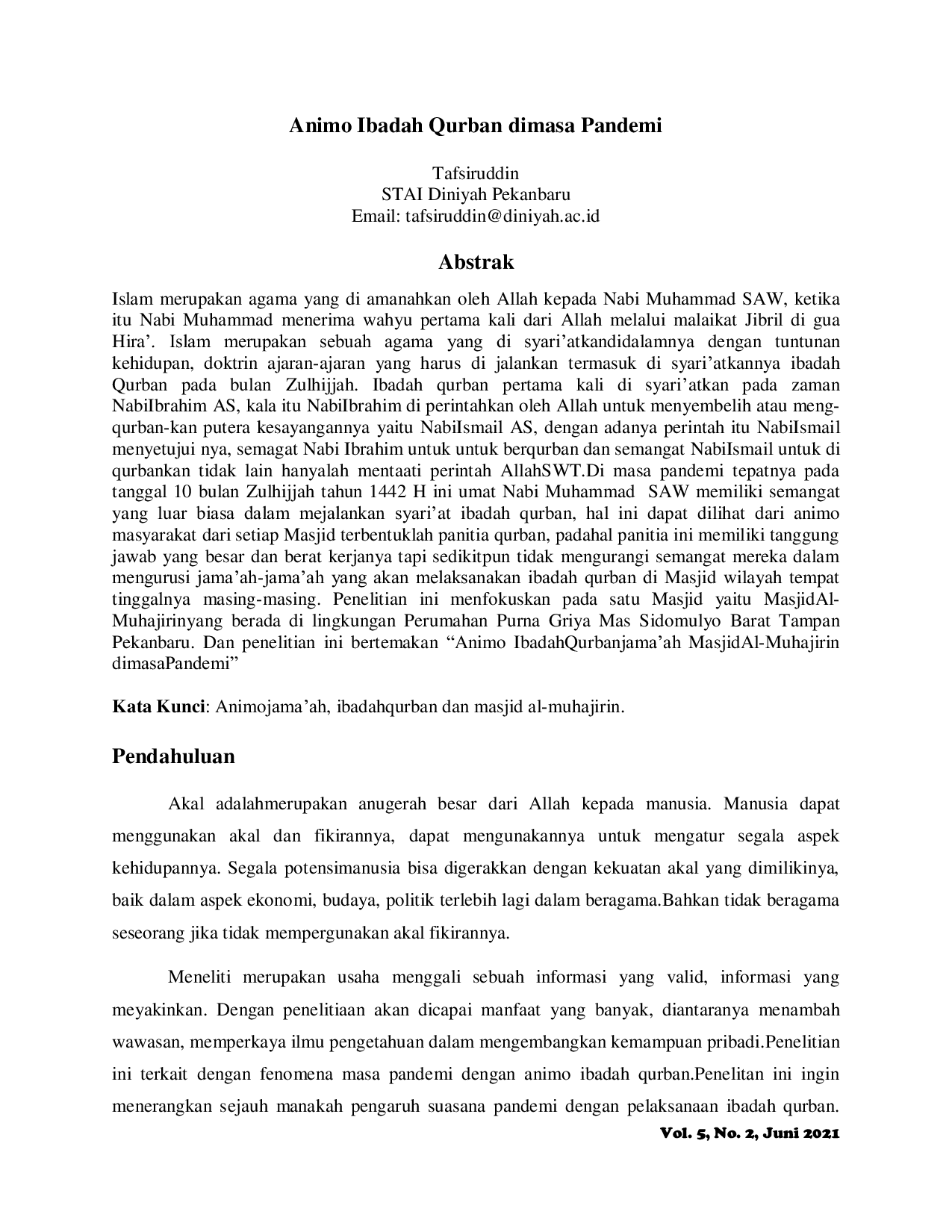One moment, please...One moment, please...Islam adalah agama yang diamanahkan oleh Allah kepada Nabi Muhammad SAW. Ibadah Qurban disyariatkan pada bulan Zulhijjah, berawal dari zaman Nabi Ibrahim AS yang diperintahkan untuk mengqurbankan putranya, Nabi Ismail AS. Penelitian ini berfokus pada animo jamaah Masjid Al-Muhajirin dalam melaksanakan ibadah qurban di masa pandemi.