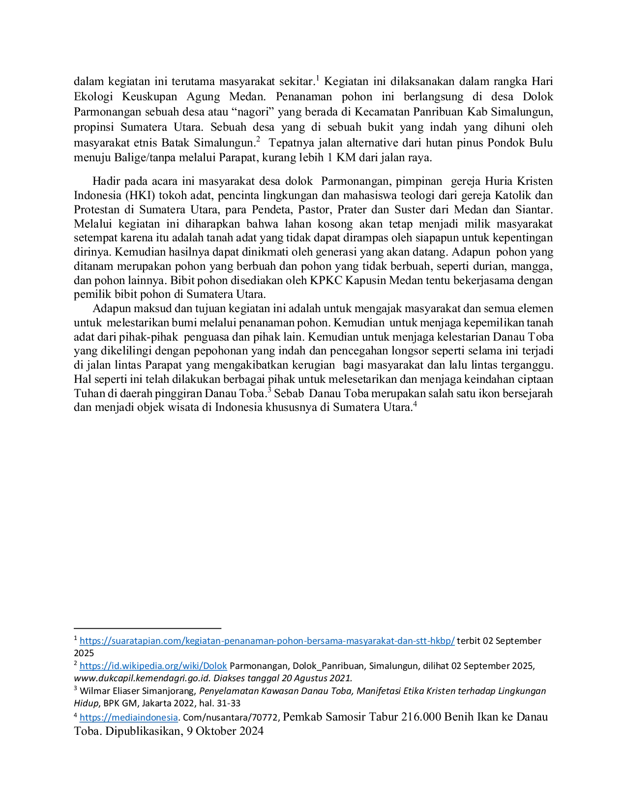 Devotion: Jurnal Pengabdian MasyarakatDevotion: Jurnal Pengabdian MasyarakatKerusakan ciptaan Allah dengan berbagai jenis yang terjadi dimana-mana merupakan salah satu isu penting yang harus diwaspadai dan ditanggulangi oleh setiap pihak. Sebab kerusakan alam sebagai ciptaan Tuhan sering terjadi karena ulah manusia itu sendiri. Jika kerusakan lingkungan hidup manusia sudah rusak akibatnya manusia mengalami kemiskinan bahkan penderitaaan yang berkepanjangan. Maka perlu dilakukan upaya perbaikan terhadap kerusakan tersebut melalui berbagai cara. Salah satu upaya untuk mengembalikan kerusakan ciptaan itu adalah dengan melakukan penanaman pohon sebagaimana yang dilakukan oleh pemerintah, gereja dan masyarakat di berbagai tempat di Indonesia. Kolaborasi antara semua pihak dan masyarakat akan mengembalikan keindahan ciptaan Tuhan. Melalui penanaman pohon di dolok Parmonangan kecamatan Panribuan kabupaten Simalungun yang dilakukan STT HKBP secara bersama-sama dengan masyarakat merupakan pengabdian masyarakat (PkM) untuk melestarikan kembali alam ini. Sehingga lahan tersebut menjadi produktif dan aman dari segala gangguan. Kalau lahan itu dibiarkan kosong akan menjadi hutan belantara yang tidak bertuan. Kemudian bisa saja dipergunakan oleh pihak lain menjadi miliknya sendiri. Pada hal tanah tersebut adalah tanah adat yang dapat diwariskan kepada generasi mendatang. Selanjutnya melalui penanaman pohon di desa Parmonangan ini daerah di pinggiran Danau Toba yang rawan longsor dapat teratasi secara pelan-pelan ketika pohon tersebut bertumbuh dengan baik. Maka harapan dan tujuan dari penanaman pohon ini adalah memberi kesadaran kepada masyarakat akan perlunya merawat bumi dengan menanam jenis-jenis pohon yang dapat membawa berkat kepada manusia dan puji-pujian bagi Tuhan sebagai Pemilik dan Pencipta bumi (Kej. 1:1). Sebab Allah melihat semua ciptaan-Nya sungguh amat baik (Kej. 1:25). Selanjutnya kepada manusia Allah memberikan seluruh ciptaan-Nya untuk dipelihara dan dirawat sebaik-baiknya.