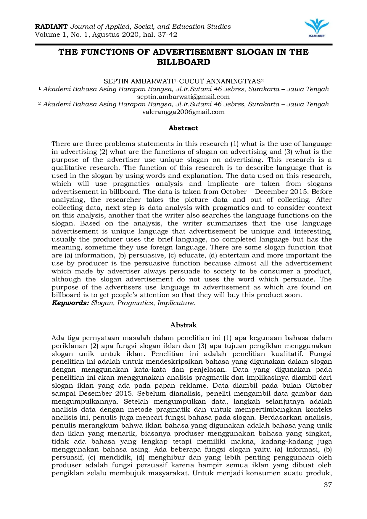 RADIANT: Journal of Applied, Social, and Education StudiesRADIANT: Journal of Applied, Social, and Education StudiesAda tiga pernyataan masalah dalam penelitian ini (1) apa kegunaan bahasa dalam periklanan (2) apa fungsi slogan iklan dan (3) apa tujuan pengiklan menggunakan slogan unik untuk iklan. Penelitian ini adalah penelitian kualitatif. Fungsi penelitian ini adalah untuk mendeskripsikan bahasa yang digunakan dalam slogan dengan menggunakan kata-kata dan penjelasan. Data yang digunakan pada penelitian ini akan menggunakan analisis pragmatik dan implikasinya diambil dari slogan iklan yang ada pada papan reklame. Data diambil pada bulan Oktober sampai Desember 2015. Sebelum dianalisis, peneliti mengambil data gambar dan mengumpulkannya. Setelah mengumpulkan data, langkah selanjutnya adalah analisis data dengan metode pragmatik dan untuk mempertimbangkan konteks analisis ini, penulis juga mencari fungsi bahasa pada slogan. Berdasarkan analisis, penulis merangkum bahwa iklan bahasa yang digunakan adalah bahasa yang unik dan iklan yang menarik, biasanya produser menggunakan bahasa yang singkat, tidak ada bahasa yang lengkap tetapi memiliki makna, kadang-kadang juga menggunakan bahasa asing. Ada beberapa fungsi slogan yaitu (a) informasi, (b) persuasif, (c) mendidik, (d) menghibur dan yang lebih penting penggunaan oleh produser adalah fungsi persuasif karena hampir semua iklan yang dibuat oleh pengiklan selalu membujuk masyarakat. Untuk menjadi konsumen suatu produk, meskipun slogan iklan tidak menggunakan kata yang membujuk. Tujuan pengiklan menggunakan bahasa dalam iklan seperti yang ditemukan di papan iklan adalah untuk mendapatkan perhatian orang sehingga mereka akan segera membeli produk ini.