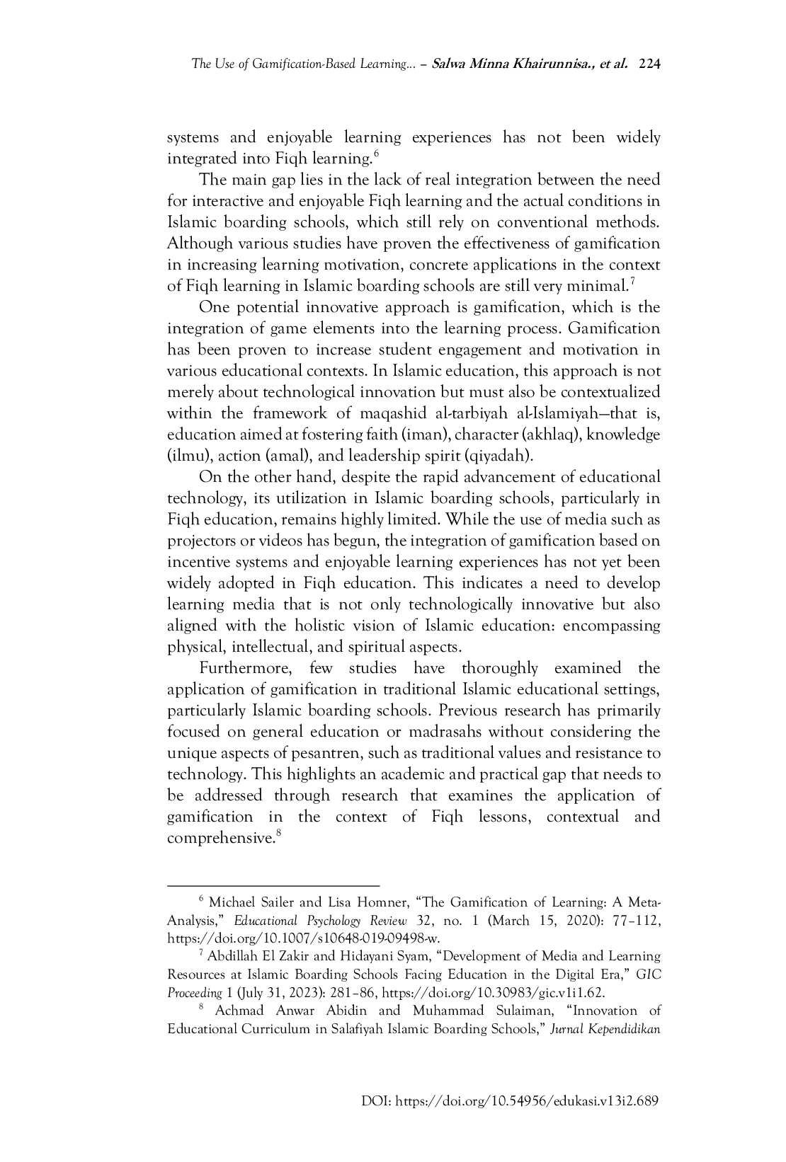 EDUKASI : Jurnal Pendidikan Islam (e-Journal)EDUKASI : Jurnal Pendidikan Islam (e-Journal)Penelitian ini bertujuan untuk mengeksplorasi implementasi media pembelajaran berbasis gamifikasi dalam meningkatkan motivasi belajar siswa pada mata pelajaran Fiqh di Pondok Pesantren Darul Muslimin Muhammadiyah Pare. Dengan menggunakan pendekatan kualitatif deskriptif, data dikumpulkan melalui observasi kelas, wawancara mendalam, dan analisis dokumen. Hasil penelitian menunjukkan bahwa gamifikasi, khususnya melalui aplikasi Quizizz, meningkatkan motivasi belajar siswa. Elemen permainan seperti poin, level, dan kompetisi menciptakan lingkungan belajar yang lebih menyenangkan, interaktif, dan menantang. Siswa menjadi lebih bersemangat, partisipatif, dan terlibat dalam proses belajar. Namun, penelitian juga mengidentifikasi beberapa tantangan, termasuk kompetensi digital terbatas di antara guru, resistensi budaya terhadap inovasi teknologi dalam pesantren, dan infrastruktur yang tidak memadai. Penelitian ini menyiratkan pentingnya pelatihan guru dan dukungan infrastruktur untuk praktik gamifikasi yang berkelanjutan. Keaslian penelitian ini terletak pada konteksnya yang spesifik, yaitu integrasi gamifikasi dalam pengajaran Fiqh dalam sebuah pesantren Salafi modern. Penelitian ini berkontribusi pada tubuh penelitian yang sedang berkembang tentang pendidikan Islam dan integrasi teknologi, serta menyediakan dasar untuk studi komparatif dan kuantitatif di masa depan.