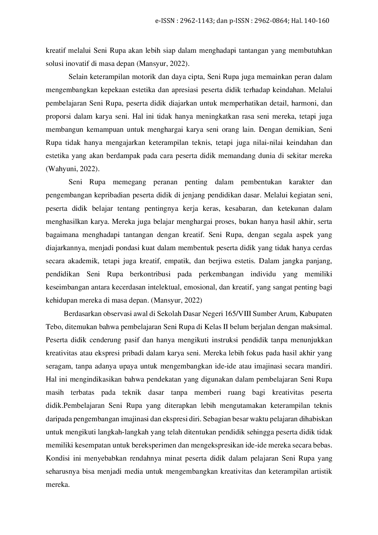 Penelitian menunjukkan bahwa penerapan metode Free Expression secara signifikan meningkatkan proses pembelajaran dan kreativitas peserta didik kelas II SDN 165/VIII Sumber Arum, terbukti dari kenaikan nilai observasi pendidik dan peserta serta nilai tes unjuk kerja yang bergerak dari 68,6 pada pra‑siklus menjadi 87 pada siklus II.Semua indikator keberhasilan penelitian telah tercapai, dengan nilai observasi pendidik mencapai 90 dan nilai observasi peserta mencapai 92,5 pada siklus II.Oleh karena itu, metode Free Expression dapat dianggap efektif untuk mengembangkan kreativitas seni rupa pada tingkat pendidikan dasar.