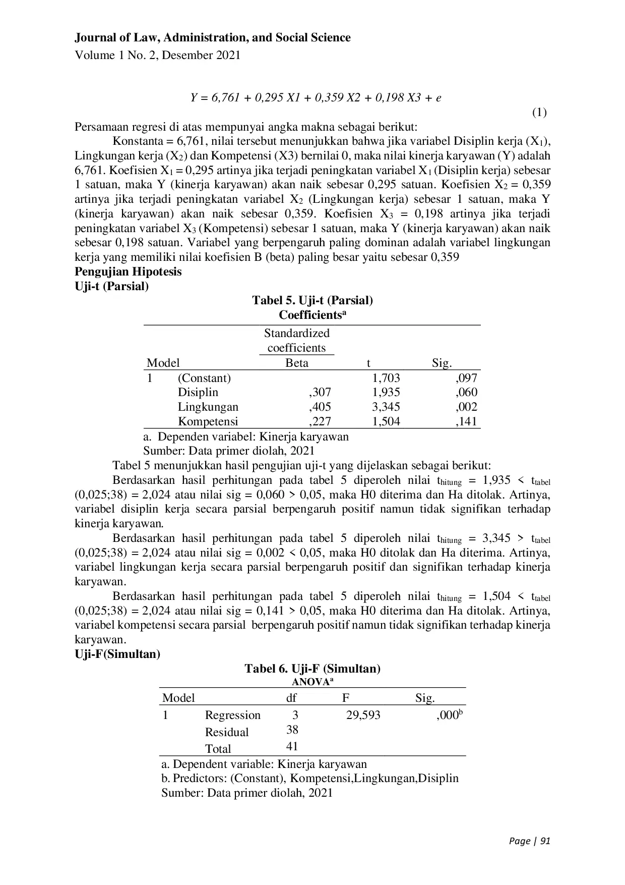 Journal of Law, Administration, and Social ScienceJournal of Law, Administration, and Social SciencePenelitian ini bertujuan untuk mengetahui pengaruh disiplin kerja, lingkungan kerja dan kompetensi terhadap kinerja karyawan Dinas Pemberdayaan Masyarakat dan Desa Kabupaten Nganjuk. Dalam penelitian ini menggunakan metode penelitian kuantitatif dengan teknik pengumpulan data melalui wawancara, observasi dan penyebaran kuesioner. Populasi dalam penelitian ini adalah pegawai Dinas Pemberdayaan Masyarakay dan Desa Kabupaten Nganjuk yang berjumlah 42 orang.