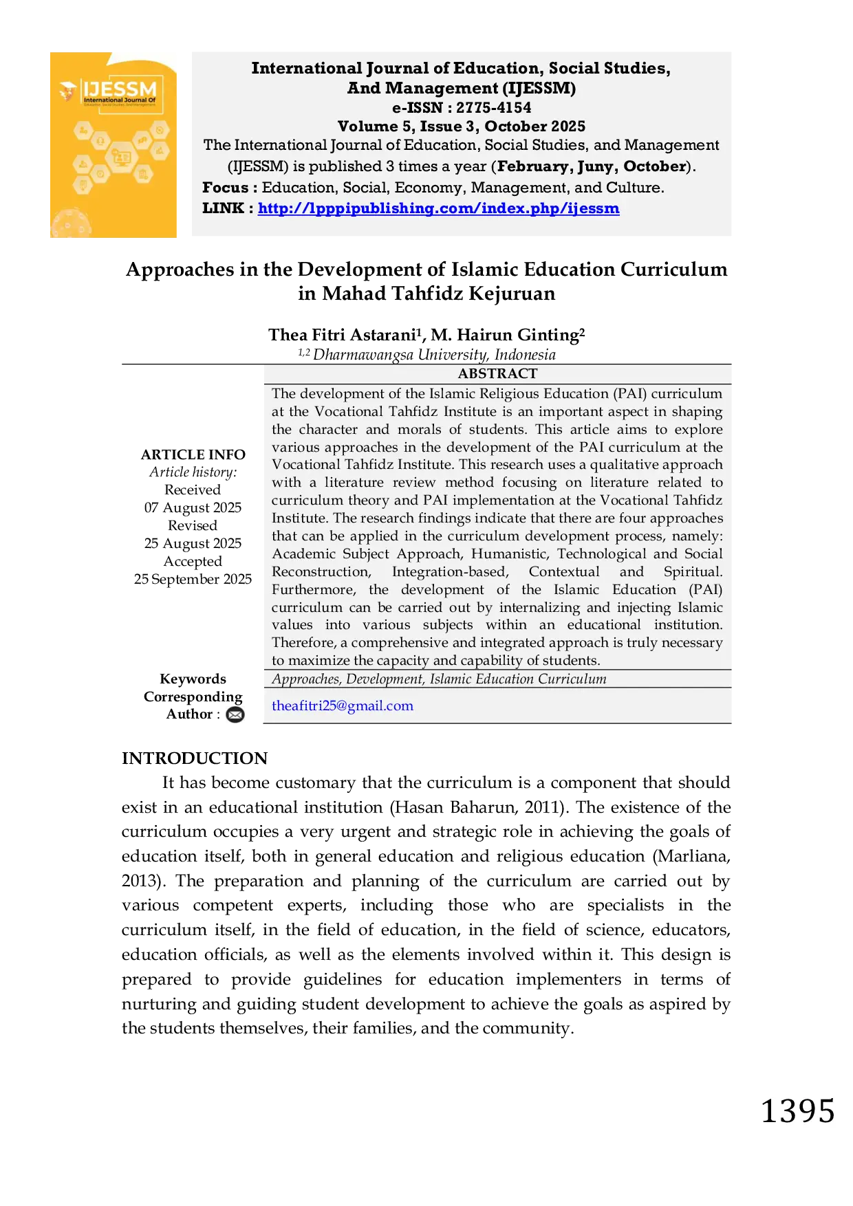 International Journal Of Education, Social Studies, And Management (IJESSM)International Journal Of Education, Social Studies, And Management (IJESSM)Pengembangan kurikulum Pendidikan Agama Islam (PAI) di Mahad Tahfidz Kejuruan merupakan aspek penting dalam membentuk karakter dan moral siswa. Artikel ini bertujuan untuk mengeksplorasi berbagai pendekatan dalam pengembangan kurikulum PAI di Mahad Tahfidz Kejuruan. Penelitian ini menggunakan pendekatan kualitatif dengan metode tinjauan literatur yang berfokus pada literatur terkait teori kurikulum dan implementasi PAI di Mahad Tahfidz Kejuruan. Temuan penelitian menunjukkan bahwa terdapat empat pendekatan yang dapat diterapkan dalam proses pengembangan kurikulum, yaitu: Pendekatan Mata Pelajaran Akademik, Humanistik, Teknologi dan Rekonstruksi Sosial, Spiritual. Berbasis Integrasi, Kontekstual. Lebih lanjut, pengembangan kurikulum Pendidikan Agama Islam (PAI) dapat dilakukan dengan menginternalisasikan dan menyuntikkan nilai-nilai Islam ke dalam berbagai mata pelajaran dalam suatu institusi pendidikan. Oleh karena itu, pendekatan yang komprehensif dan terintegrasi sangat diperlukan untuk memaksimalkan kapasitas dan kapabilitas siswa.