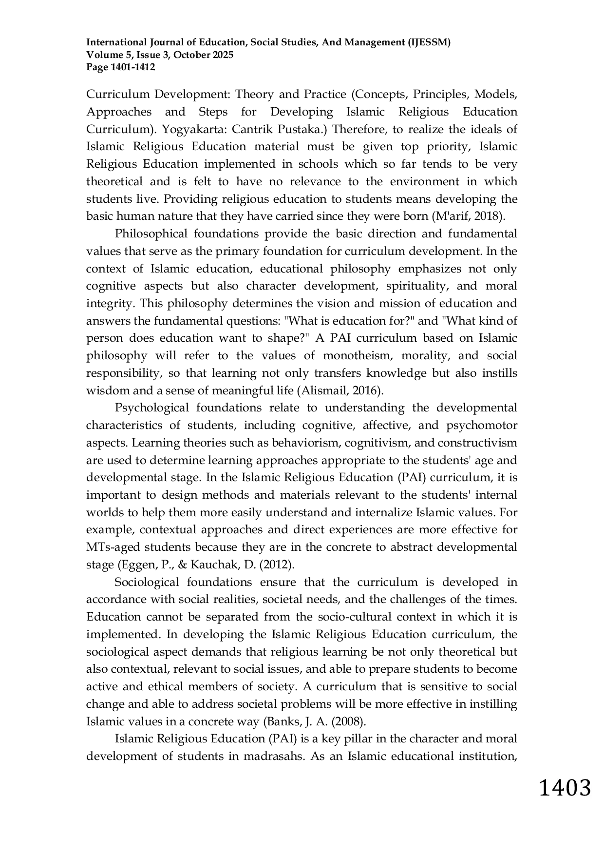 Penelitian lanjutan disarankan untuk mengkaji dampak jangka panjang integrasi lengkap dasar filosofis, psikologis, dan sosiologis terhadap pembentukan karakter siswa. Selain itu, perlu dikembangkan kerangka pelatihan guru untuk mengoptimalkan aplikasi ketiga dasar tersebut dalam perencanaan pembelajaran. Studi tentang pendekatan kontekstual yang menghubungkan nilai-nilai Islam dengan isu sosial kontemporer di masyarakat juga relevan untuk meninjau keefektifan kurikulum.