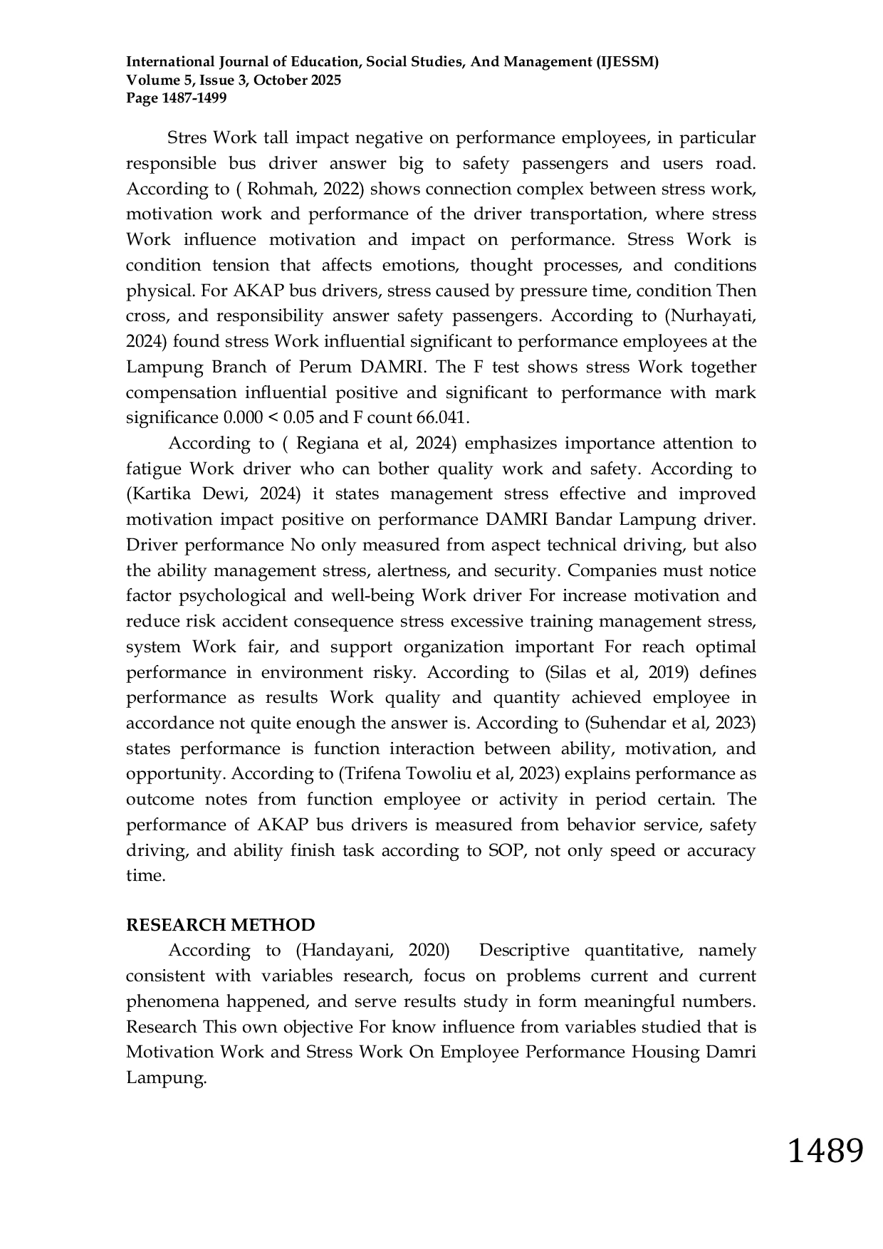 International Journal Of Education, Social Studies, And Management (IJESSM)International Journal Of Education, Social Studies, And Management (IJESSM)Penelitian ini menguji pengaruh motivasi kerja dan stres kerja terhadap kinerja pengemudi bus AKAP (Antar Kota Antar Provinsi) di Perum DAMRI Lampung Cabang. Menggunakan pendekatan kuantitatif dengan analisis regresi linier berganda, penelitian ini melibatkan populasi sebanyak 112 pengemudi, dengan sampel purposif sebanyak 53 responden. Hasil penelitian menunjukkan bahwa motivasi kerja memiliki pengaruh positif dan signifikan terhadap kinerja pengemudi (β = 0,613; Sig. = 0,000), yang mengindikasikan bahwa motivasi yang lebih tinggi meningkatkan kinerja. Sebaliknya, stres kerja memiliki dampak negatif dan signifikan (β = -0,551; Sig. = 0,000), yang berarti peningkatan stres menurunkan kinerja. Secara bersamaan, motivasi kerja dan stres kerja secara signifikan mempengaruhi kinerja pengemudi (F = 77,167; Sig. = 0,000). Penelitian ini menyimpulkan bahwa meningkatkan motivasi kerja dan mengelola stres kerja secara efektif merupakan strategi kunci untuk meningkatkan kinerja pengemudi bus AKAP. Namun, penelitian ini terbatas pada pengemudi di Perum DAMRI Lampung Cabang, dan hasilnya mungkin tidak dapat digeneralisasikan ke konteks lain. Penelitian ini memberikan bukti empiris yang menekankan bahwa motivasi dan manajemen stres merupakan penentu kritis kinerja pengemudi dalam organisasi transportasi.