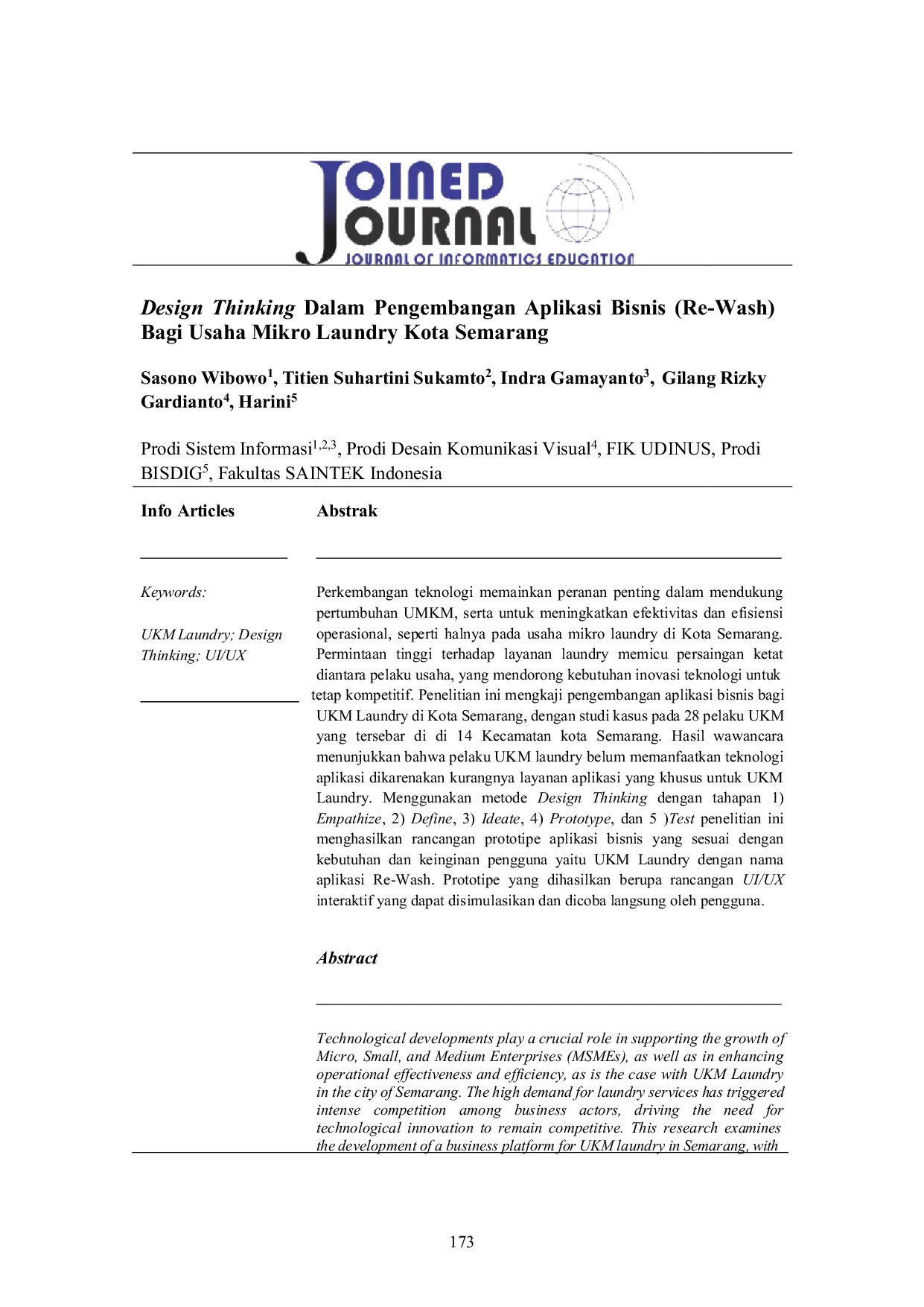 Joined Journal (Journal of Informatics Education)Joined Journal (Journal of Informatics Education)Perkembangan teknologi memainkan peranan penting dalam mendukung pertumbuhan UMKM, serta untuk meningkatkan efektivitas dan efisiensi operasional, seperti halnya pada usaha mikro laundry di Kota Semarang. Permintaan tinggi terhadap layanan laundry memicu persaingan ketat diantara pelaku usaha, yang mendorong kebutuhan inovasi teknologi untuk tetap kompetitif. Penelitian ini mengkaji pengembangan aplikasi bisnis bagi UKM Laundry di Kota Semarang, dengan studi kasus pada 28 pelaku UKM yang tersebar di di 14 Kecamatan kota Semarang. Hasil wawancara menunjukkan bahwa pelaku UKM laundry belum memanfaatkan teknologi aplikasi dikarenakan kurangnya layanan aplikasi yang khusus untuk UKM Laundry. Menggunakan metode Design Thinking dengan tahapan 1) Empathize, 2) Define, 3) Ideate, 4) Prototype, dan 5 )Test penelitian ini menghasilkan rancangan prototipe aplikasi bisnis yang sesuai dengan kebutuhan dan keinginan pengguna yaitu UKM Laundry dengan nama aplikasi Re-Wash. Prototipe yang dihasilkan berupa rancangan UI/UX interaktif yang dapat disimulasikan dan dicoba langsung oleh pengguna.