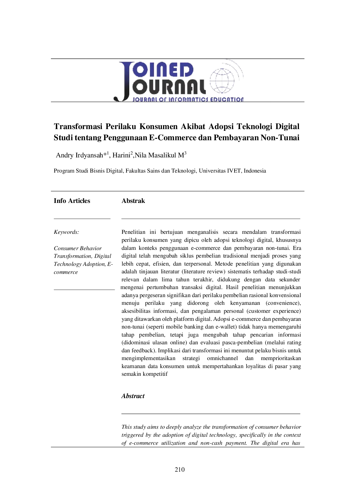 Joined Journal (Journal of Informatics Education)Joined Journal (Journal of Informatics Education)Penelitian ini bertujuan menganalisis secara mendalam transformasi perilaku konsumen yang dipicu oleh adopsi teknologi digital, khususnya dalam konteks penggunaan e-commerce dan pembayaran non-tunai. Era digital telah mengubah siklus pembelian tradisional menjadi proses yang lebih cepat, efisien, dan terpersonalisasi. Metode penelitian yang digunakan adalah tinjauan literatur (literature review) sistematis terhadap studi-studi relevan dalam lima tahun terakhir, didukung dengan data sekunder mengenai pertumbuhan transaksi digital. Hasil penelitian menunjukkan adanya pergeseran signifikan dari perilaku pembelian rasional konvensional menuju perilaku yang didorong oleh kenyamanan (convenience), aksesibilitas informasi, dan pengalaman personal (customer experience) yang ditawarkan oleh platform digital. Adopsi e-commerce dan pembayaran non-tunai (seperti mobile banking dan e-wallet) tidak hanya memengaruhi tahap pembelian, tetapi juga mengubah tahap pencarian informasi (didominasi ulasan online) dan evaluasi pasca-pembelian (melalui rating dan feedback). Implikasi dari transformasi ini menuntut pelaku bisnis untuk mengimplementasikan strategi omnichannel dan memprioritaskan keamanan data konsumen untuk mempertahankan loyalitas di pasar yang semakin kompetitif.
