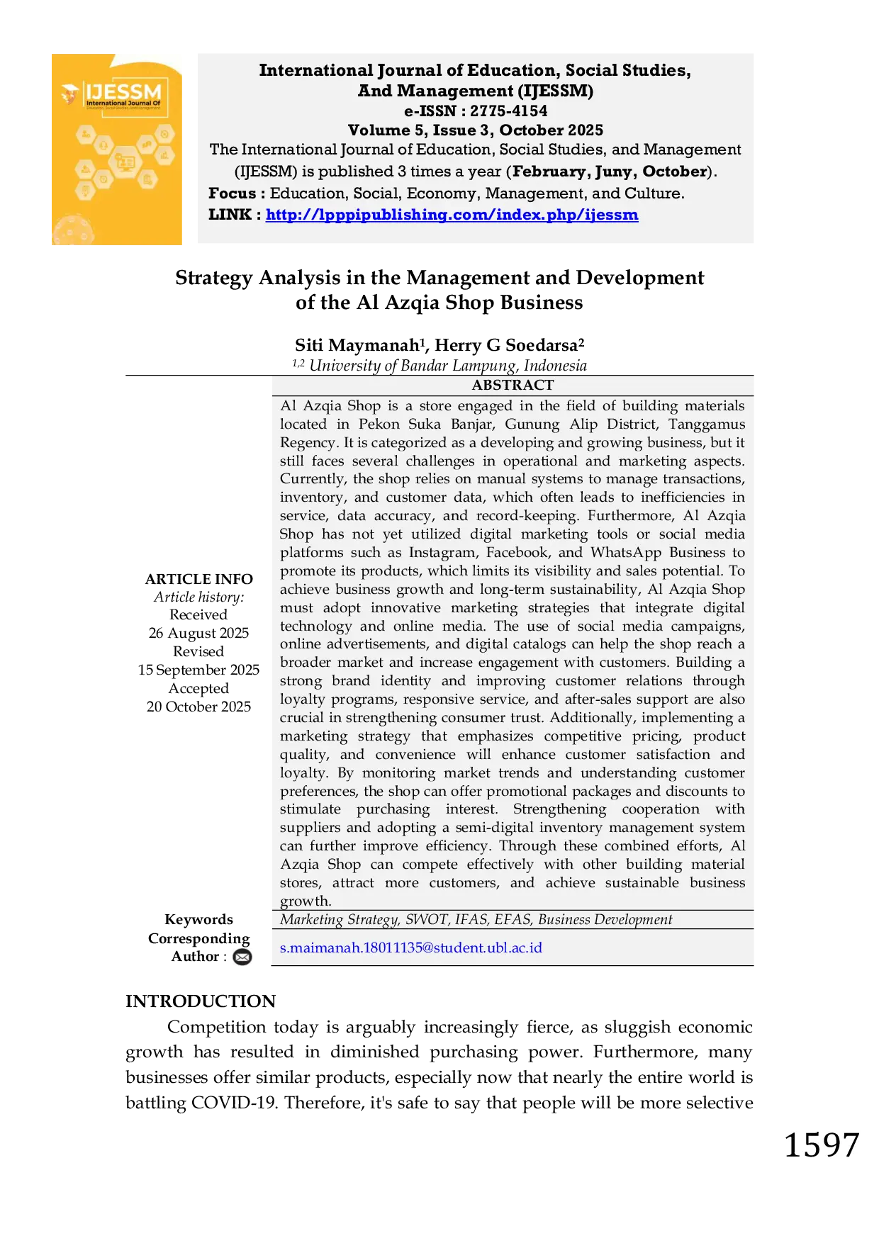 International Journal Of Education, Social Studies, And Management (IJESSM)International Journal Of Education, Social Studies, And Management (IJESSM)Al Azqia Shop adalah toko yang bergerak di bidang bahan bangunan yang terletak di Pekon Suka Banjar, Gunung Alip District, Tanggamus Regency. Toko ini dikategorikan sebagai bisnis yang sedang berkembang dan tumbuh, tetapi masih menghadapi beberapa tantangan dalam aspek operasional dan pemasaran. Saat ini, toko mengandalkan sistem manual untuk mengelola transaksi, inventaris, dan data pelanggan, yang seringkali menyebabkan inefisiensi dalam pelayanan, akurasi data, dan pencatatan. Selain itu, Al Azqia Shop belum memanfaatkan alat pemasaran digital atau platform media sosial seperti Instagram, Facebook, dan WhatsApp Business untuk mempromosikan produknya, yang membatasi visibilitas dan potensi penjualannya. Untuk mencapai pertumbuhan bisnis dan keberlanjutan jangka panjang, Al Azqia Shop harus mengadopsi strategi pemasaran inovatif yang mengintegrasikan teknologi digital dan media online. Pemanfaatan kampanye media sosial, iklan online, dan katalog digital dapat membantu toko menjangkau pasar yang lebih luas dan meningkatkan keterlibatan dengan pelanggan. Membangun identitas merek yang kuat dan meningkatkan hubungan pelanggan melalui program loyalitas, pelayanan yang responsif, dan dukungan purna jual juga sangat penting dalam memperkuat kepercayaan konsumen. Selain itu, implementasi strategi pemasaran yang menekankan harga yang kompetitif, kualitas produk, dan kenyamanan akan meningkatkan kepuasan dan loyalitas pelanggan. Dengan memantau tren pasar dan memahami preferensi pelanggan, toko dapat menawarkan paket promosi dan diskon untuk menstimulasi minat pembelian. Memperkuat kerja sama dengan pemasok dan mengadopsi sistem manajemen inventaris semi-digital dapat lebih meningkatkan efisiensi. Melalui upaya-upaya gabungan ini, Al Azqia Shop dapat bersaing secara efektif dengan toko bahan bangunan lainnya, menarik lebih banyak pelanggan, dan mencapai pertumbuhan bisnis yang berkelanjutan.