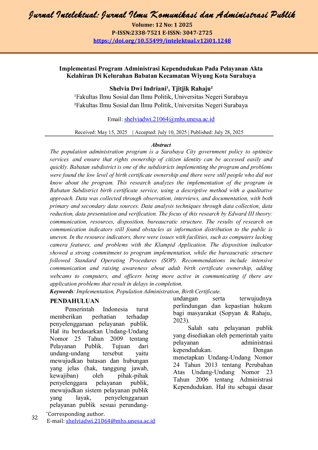 INTELEKTUAL (Jurnal Administrasi Publik dan Ilmu Komunikasi)INTELEKTUAL (Jurnal Administrasi Publik dan Ilmu Komunikasi)Program administrasi kependudukan merupakan kebijakan pemerintah Kota Surabaya untuk mengoptimalkan layanan dan memastikan bahwa hak kepemilikan identitas warga dapat diakses dengan mudah dan cepat. Kelurahan Babatan merupakan salah satu kelurahan yang mengimplementasikan program tersebut dan ditemukan masalah yaitu tingkat kepemilikan akta kelahiran yang rendah serta masih ada masyarakat yang belum mengetahui tentang program tersebut. Penelitian ini menganalisis implementasi program di Kelurahan Babatan pada pelayanan akta kelahiran, menggunakan metode deskriptif dengan pendekatan kualitatif. Pengumpulan data dilakukan melalui observasi, wawancara, dan dokumentasi, dengan sumber data primer dan sekunder. Teknik analisis data meliputi pengumpulan data, reduksi data, presentasi data, dan verifikasi. Fokus penelitian menggunakan teori Edward III: komunikasi, sumber daya, disposisi, struktur birokrasi. Hasil penelitian pada indikator komunikasi masih ditemukan kendala karena penyebaran informasi kepada masyarakat belum merata. Pada indikator sumber daya, terdapat masalah terkait fasilitas, seperti komputer yang kekurangan fitur kamera, dan masalah pada Aplikasi Klampid. Indikator disposisi menunjukkan komitmen yang kuat terhadap implementasi program, sementara struktur birokrasi mengikuti Standar Operasional Prosedur (SOP). Rekomendasi meliputi komunikasi intensif dan peningkatan kesadaran tentang kepemilikan akta kelahiran dewasa, penambahan webcam pada komputer, dan petugas lebih aktif berkomunikasi jika ada masalah aplikasi yang menyebabkan keterlambatan penyelesaian.