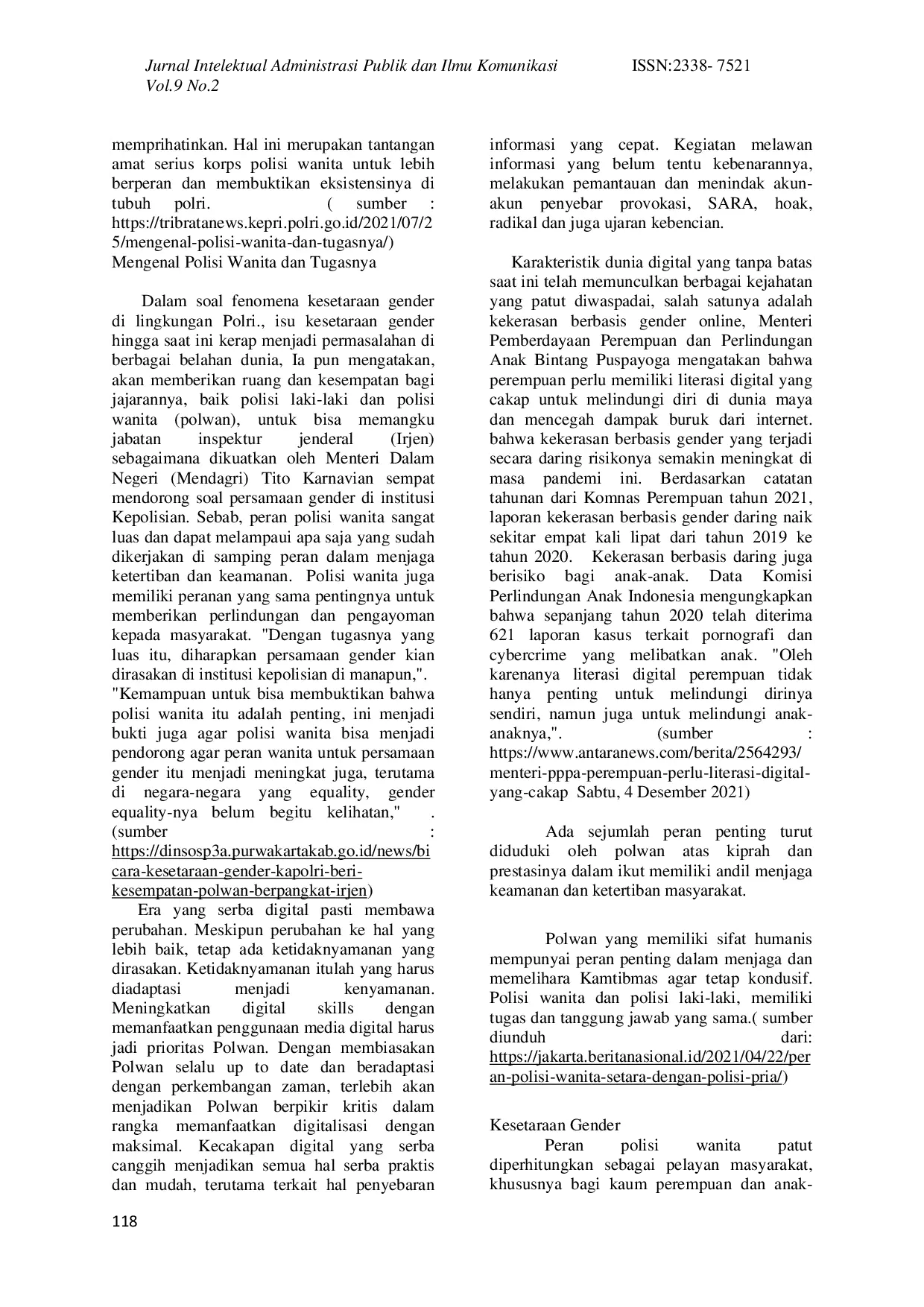 INTELEKTUAL (Jurnal Administrasi Publik dan Ilmu Komunikasi)INTELEKTUAL (Jurnal Administrasi Publik dan Ilmu Komunikasi)Polisi Wanita (Polwan) merupakan bagian penting dari institusi kepolisian. Dalam pelaksanaan tugasnya, Polwan memiliki peran dan fungsi strategis, yaitu sebagai penegak hukum, pelindung, serta penyedia layanan kepada masyarakat untuk mewujudkan keamanan dan ketertiban umum. Pada era digital, keberadaan Polwan sangat diperlukan untuk menangani masalah konten media sosial yang masif di platform digital. Penelitian ini menggunakan metode kajian pustaka. Hasil analisis menunjukkan bahwa peran Polwan pada era digital, selain tugas utama penegakan hukum, juga berperan sebagai aktor utama dalam mengisi konten media sosial sebagai sarana edukasi kesadaran hukum demi terciptanya keamanan dan ketertiban publik. Untuk melaksanakan peran ganda tersebut, Polwan harus memiliki keterampilan literasi digital yang memadai.