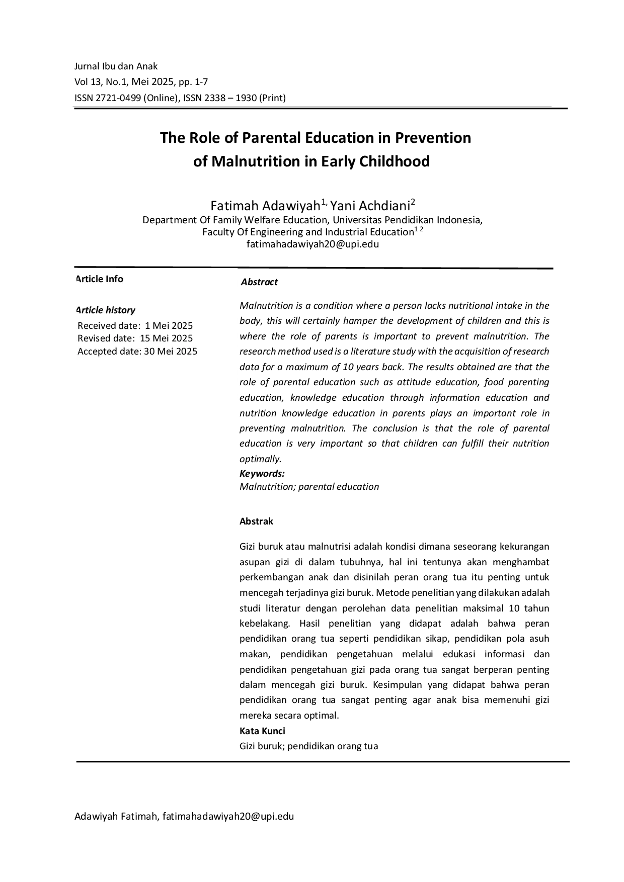 JURNAL IBU DAN ANAKJURNAL IBU DAN ANAKGizi buruk atau malnutrisi adalah kondisi dimana seseorang kekurangan asupan gizi di dalam tubuhnya, hal ini tentunya akan menghambat perkembangan anak dan disinilah peran orang tua itu penting untuk mencegah terjadinya gizi buruk. Metode penelitian yang dilakukan adalah studi literatur dengan perolehan data penelitian maksimal 10 tahun kebelakang. Hasil penelitian yang didapat adalah bahwa peran pendidikan orang tua seperti pendidikan sikap, pendidikan pola asuh makan, pendidikan pengetahuan melalui edukasi dan pendidikan pengetahuan gizi pada orang tua sangat berperan penting dalam mencegah gizi buruk. Kesimpulan yang didapat bahwa peran pendidikan orang tua sangat penting agar anak bisa memenuhi gizi mereka secara optimal.