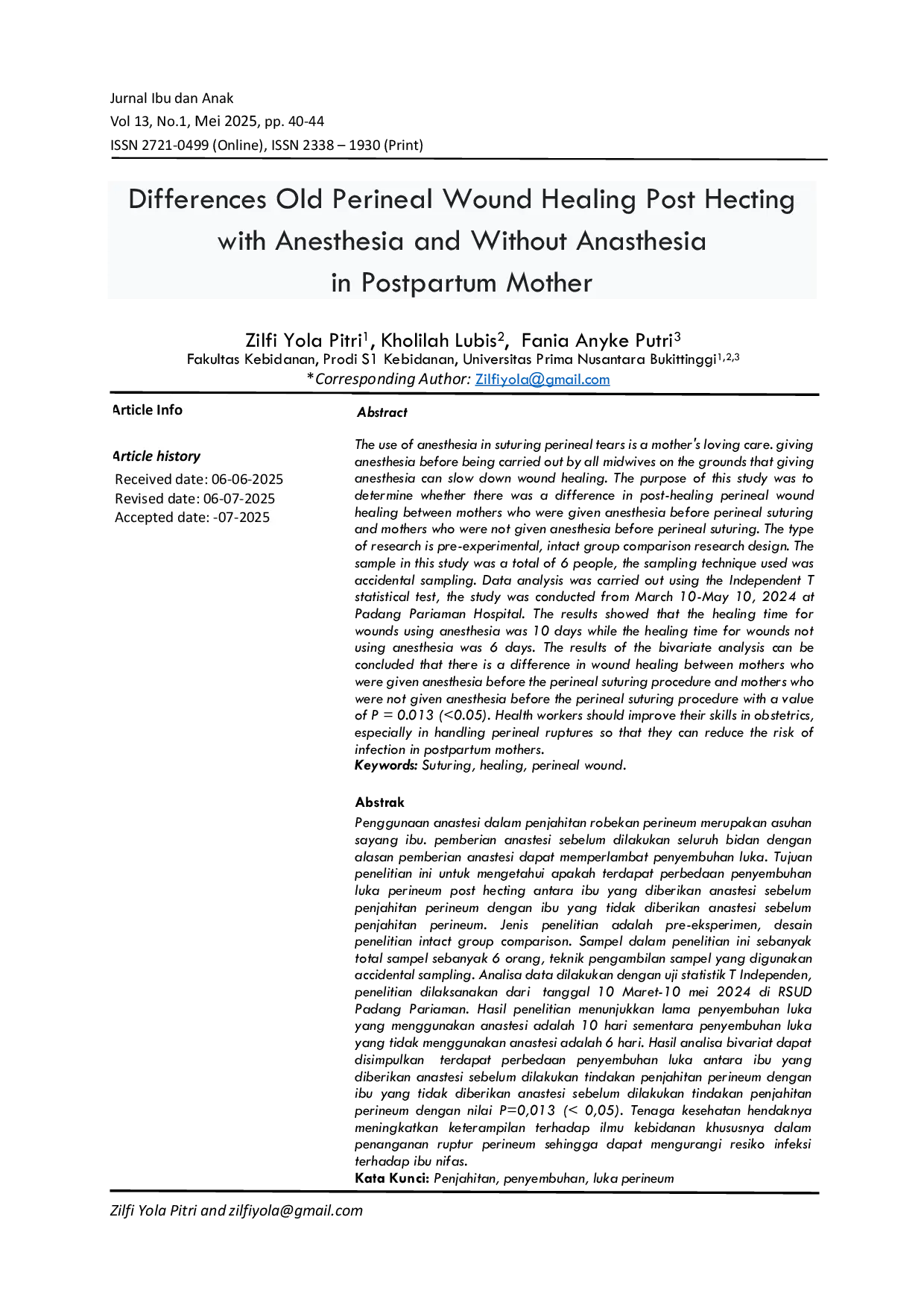 JURNAL IBU DAN ANAKJURNAL IBU DAN ANAKPenggunaan anastesi dalam penjahitan robekan perineum merupakan asuhan sayang ibu. pemberian anastesi sebelum dilakukan seluruh bidan dengan alasan pemberian anastesi dapat memperlambat penyembuhan luka. Tujuan penelitian ini untuk mengetahui apakah terdapat perbedaan penyembuhan luka perineum post hecting antara ibu yang diberikan anastesi sebelum penjahitan perineum dengan ibu yang tidak diberikan anastesi sebelum penjahitan perineum. Jenis penelitian adalah pre-eksperimen, desain penelitian intact group comparison. Sampel dalam penelitian ini sebanyak total sampel sebanyak 6 orang, teknik pengambilan sampel yang digunakan accidental sampling. Analisa data dilakukan dengan uji statistik T Independen, penelitian dilaksanakan dari tanggal 10 Maret-10 mei 2024 di RSUD Padang Pariaman. Hasil penelitian menunjukkan lama penyembuhan luka yang menggunakan anastesi adalah 10 hari sementara penyembuhan luka yang tidak menggunakan anastesi adalah 6 hari. Hasil analisa bivariat dapat disimpulkan terdapat perbedaan penyembuhan luka antara ibu yang diberikan anastesi sebelum dilakukan tindakan penjahitan perineum dengan ibu yang tidak diberikan anastesi sebelum dilakukan tindakan penjahitan perineum dengan nilai P=0,013 (< 0,05). Tenaga kesehatan hendaknya meningkatkan keterampilan terhadap ilmu kebidanan khususnya dalam penanganan ruptur perineum sehingga dapat mengurangi resiko infeksi terhadap ibu nifas.