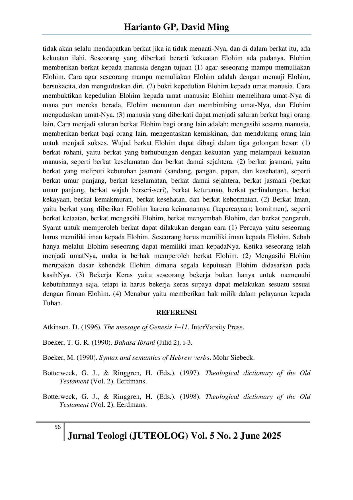 Jurnal Teologi (JUTEOLOG)Jurnal Teologi (JUTEOLOG)Kata ―berkat‖ diucapkan menjadi memberkati dengan menyebut nama Yahweh dan digunakan untuk menggambarkan hubungan antara atasan dan bawahan, yaitu ketika bertemu dengan atasan, bawahan harus berlutut. Penelitian ini menjawab pertanyaan: Bagaimana Pentateukh berbicara tentang Janji Elohim sebagai sumber berkat? Bagaimana Pentateukh berbicara tentang otoritas berkat? Bagaimana Pentateukh berbicara tentang tujuan berkat? Bagaimana dengan Pentateukh? Berbicara tentang bentuk-bentuk berkat? Bagaimana Pentateukh berbicara tentang kualifikasi untuk berkat? Jawaban: (1) Janji Elohim bahwa Abraham adalah sumber berkat bagi umat-Nya. (2) Elohim berwenang atas berkat yang diberikan kepada manusia. (3) Elohim memberikan berkat kepada manusia untuk memampukan seseorang memuliakan Elohim, bukti kepedulian Elohim kepada manusia, dan manusia yang diberkati dapat menjadi saluran berkat bagi sesama. (4) Bentuk berkat Elohim yaitu berkat rohani, berkat jasmani, dan berkat Iman. (5) Syarat untuk memperoleh berkat yaitu memiliki iman, mengasihi Elohim, bekerja keras, dan menabur.