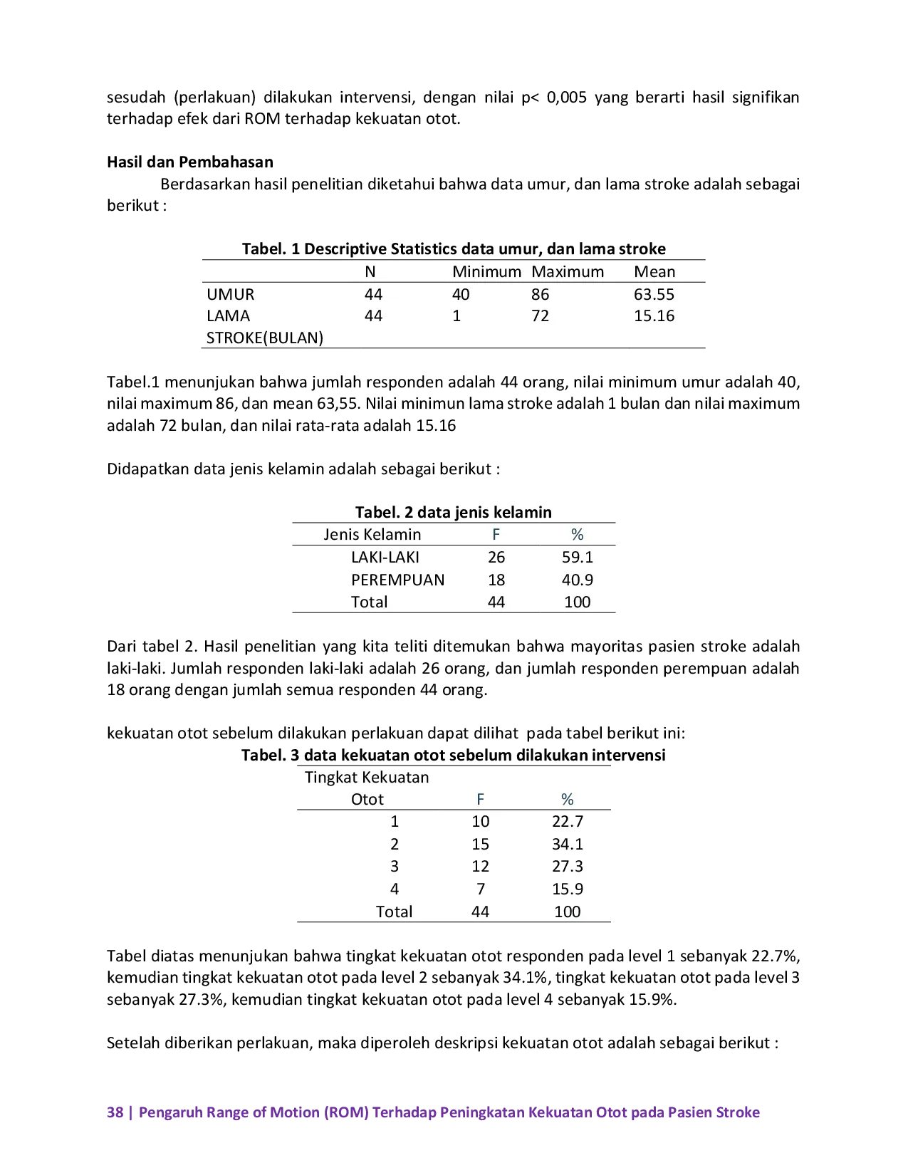 INDOGENIUSINDOGENIUSTujuan: Penelitian ini bertujuan untuk mengetahui pengaruh Range Of Motion (ROM) terhadap kekuatan otot pada pasien stroke di daerah Ciamis. Metode: Penelitian ini menggunakan jenis metode kuantitatif, dan desain penelitian Pre Experimental dengan pendekatan one group pre test – post test. Penelitian ini menggunakan dua variabel yaitu variabel bebas (independen) berupa Range Of Motion (ROM) dan variabel terikat (dependen) berupa peningkatan otot. Populasi yang digunakan dalam penelitian ini adalah penderita stroke yang berada di Daerah Ciamis yaitu sebanyak 44 orang. Penelitian dilaksanakan pada tanggal 15 November 2021. Penelitian ini menggunakan teknik pengambilan sample “acciedental sampling yaitu pengambilan sampel yang dilakukan dengan cara kebetulan bertemu langsung di jadikan sample, dan tidak ada pemaksaan dalam penetapan sample. Berdasarkan kriteria inklusi dan kriteria ekslusi maka sampel dalam penelitian ini ditetapkan sebanyak 44 orang. Hasil: Berdasarkan tabel.7 yang terlampir diketahui bahwa nilai signifikan kekuatan otot sebelum dan sesudah diberikannya intervensi Range Of Motion (ROM) sebesar 0.000. Hal ini membuktikan bahwa ROM berpengaruh dalam meningkatkan kekuatan otot.
