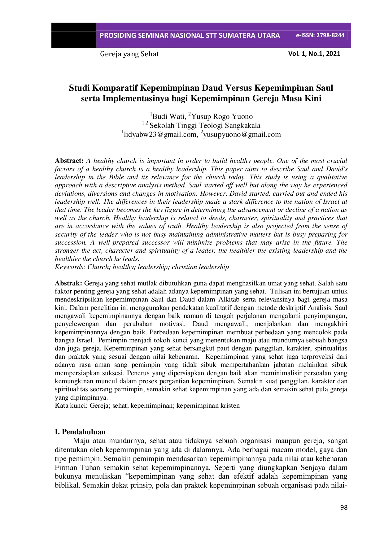 PROSIDING STT Sumatera UtaraPROSIDING STT Sumatera UtaraGereja yang sehat mutlak dibutuhkan guna dapat menghasilkan umat yang sehat. Salah satu faktor penting gereja yang sehat adalah adanya kepemimpinan yang sehat. Tulisan ini bertujuan untuk mendeskripsikan kepemimpinan Saul dan Daud dalam Alkitab serta relevansinya bagi gereja masa kini.