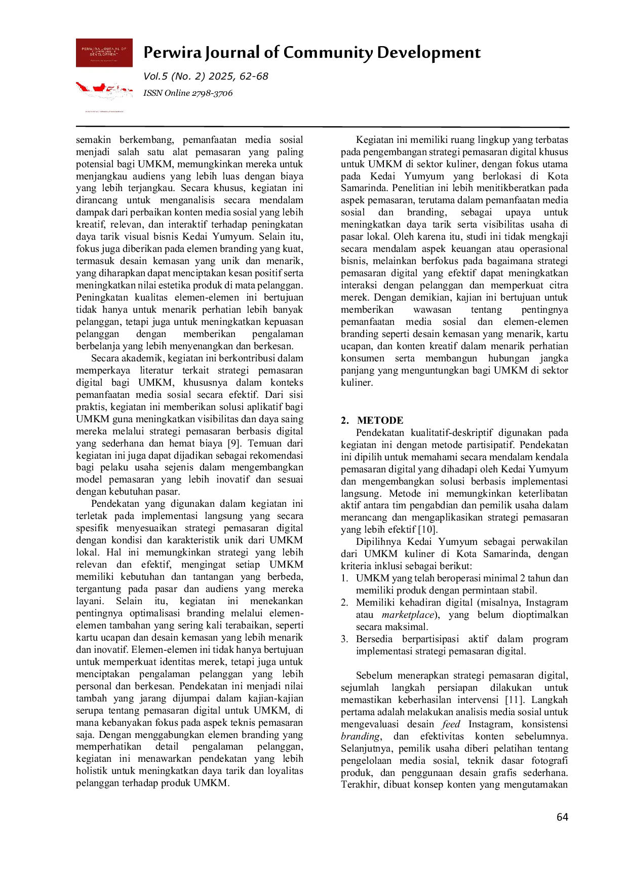 Perwira Journal of Community DevelopmentPerwira Journal of Community DevelopmentUsaha Mikro, Kecil, dan Menengah (UMKM) menghadapi tantangan dalam mengadopsi strategi pemasaran digital yang efektif, terutama dalam meningkatkan visibilitas dan keterlibatan pelanggan. Kegiatan ini bertujuan untuk mengoptimalkan pemasaran digital UMKM melalui strategi berbasis media sosial dengan studi kasus pada Kedai Yumyum, sebuah bisnis kuliner di Samarinda. Kegiatan dilakukan dengan menggunakan pendekatan kualitatif-deskriptif melalui metode partisipatif dalam bentuk pengabdian masyarakat. Hasilnya menunjukkan terjadi peningkatan jumlah pengikut ( 76%), engagement rate ( 176%), dan jumlah pesanan ( 85,7%) setelah dilakukan implementasi strategi pemasaran digital. Temuan ini menegaskan pentingnya strategi pemasaran berbasis media sosial bagi UMKM dalam meningkatkan daya saing dan pertumbuhan bisnis. Kegiatan lebih lanjut disarankan untuk mengeksplorasi dampak jangka panjang strategi pemasaran digital serta penerapannya dalam sektor industri lain.