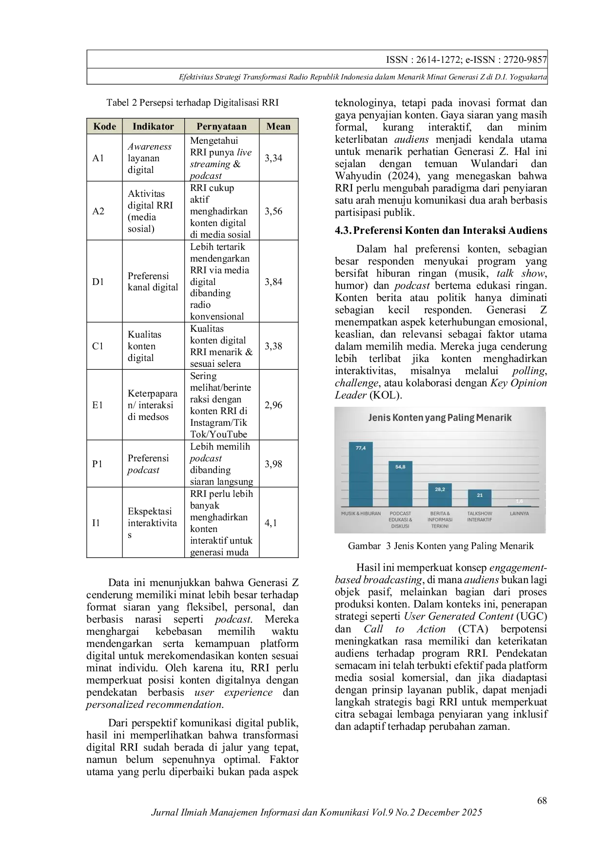 Jurnal Ilmiah Manajemen Informasi dan KomunikasiJurnal Ilmiah Manajemen Informasi dan KomunikasiPenelitian ini menganalisis efektivitas strategi transformasi digital Radio Republik Indonesia (RRI) dalam menarik minat Generasi Z di Daerah Istimewa Yogyakarta. Menggunakan pendekatan deskriptif kuantitatif melalui survei terhadap 124 responden, penelitian ini mengevaluasi persepsi, kebiasaan konsumsi media, dan harapan audiens terhadap layanan digital RRI. Hasil menunjukkan bahwa RRI telah mengadopsi berbagai inovasi digital seperti live streaming, podcast, dan distribusi konten melalui media sosial, namun tingkat kesadaran audiens masih tergolong sedang (mean 3,34), sementara preferensi terhadap kanal digital dan podcast tinggi (mean 3,84 dan 3,98). Hambatan utama adalah dominasi penggunaan media lain (77,4%) dan kurangnya promosi (47,6%). Meski demikian, Generasi Z memiliki minat tinggi terhadap konten interaktif (67,7%) dan berharap RRI lebih aktif di platform digital. Penelitian ini menyimpulkan bahwa strategi transformasi digital RRI telah berada pada arah yang benar, namun perlu diperkuat melalui peningkatan visibilitas, kualitas konten, dan interaktivitas dengan menerapkan pendekatan social-first distribution dan content-value redesign agar lebih relevan dengan karakter konsumsi media Generasi Z.