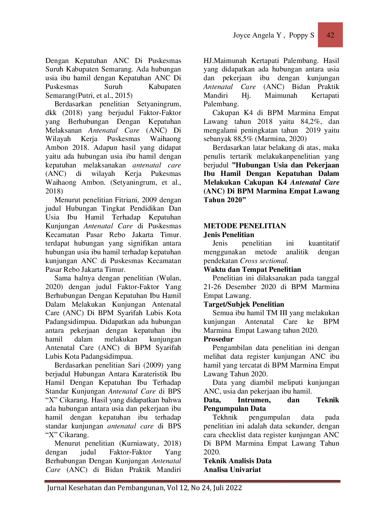 Jurnal Kesehatan dan PembangunanJurnal Kesehatan dan PembangunanEmpat Lawang merupakan salah satu daerah yang terendah cakupan K4 di provinsi Sumatera Selatan. Cakupan K4 di BPM Marmina Empat Lawang tahun 2018 yaitu 84,2%, dan mengalami peningkatan tahun 2019 yaitu sebanyak 88,5%. Cakupan K4 merupakan kunci keberhasilan dalam penurunan AKI dan AKB. Tujuan penelitian mengetahui hubungan usia dan pekerjaan ibu hamil dengan kepatuhan dalam melakukan cakupan K4.