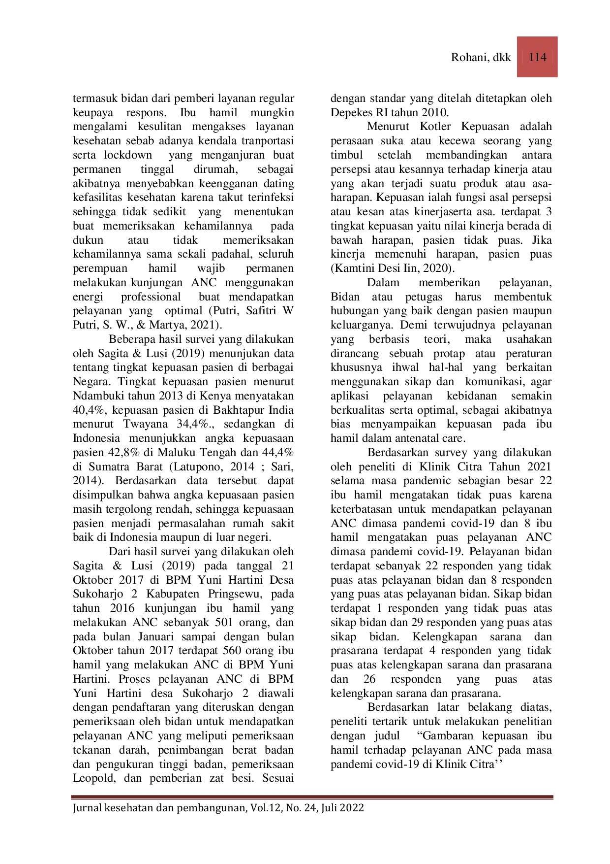 Jurnal Kesehatan dan PembangunanJurnal Kesehatan dan PembangunanAngka kematian ibu di negara-negara Asia Tenggara, termasuk Indonesia, masih tergolong tinggi. Penelitian ini bertujuan untuk mengetahui gambaran kepuasan ibu hamil terhadap pelayanan ANC di masa pandemi COVID-19. Metode penelitian yang digunakan adalah analitik dengan pendekatan kuantitatif. Hasil penelitian menunjukkan bahwa sebagian responden tidak puas terhadap pelayanan pendaftaran dan pelayanan bidan, namun sebagian besar responden puas terhadap sikap bidan dan kelengkapan sarana dan prasarana. Penelitian ini diharapkan dapat menjadi masukan bagi petugas kesehatan untuk meningkatkan kualitas pelayanan ANC.