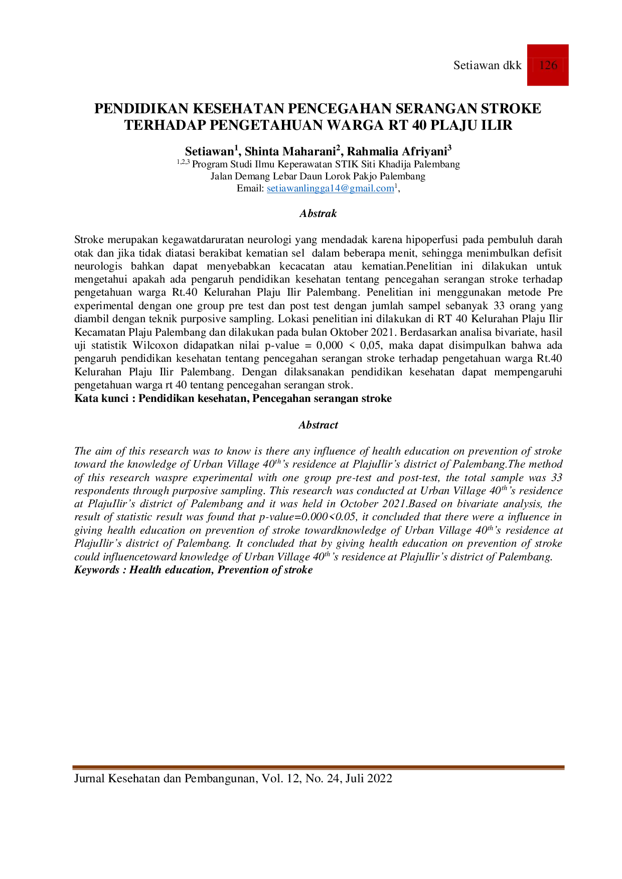Jurnal Kesehatan dan PembangunanJurnal Kesehatan dan PembangunanStroke merupakan kegawatdaruratan neurologi yang mendadak karena hipoperfusi pada pembuluh darah otak dan jika tidak diatasi berakibat kematian sel dalam beberapa menit, sehingga menimbulkan defisit neurologis bahkan dapat menyebabkan kecacatan atau kematian. Penelitian ini bertujuan untuk mengetahui apakah ada pengaruh pendidikan kesehatan tentang pencegahan serangan stroke terhadap pengetahuan warga Rt.40 Kelurahan Plaju Ilir Palembang. Penelitian ini menggunakan metode Pre-experimental dengan one group pre-test dan post-test dengan jumlah sampel sebanyak 33 orang yang diambil dengan teknik purposive sampling. Lokasi penelitian ini dilakukan di RT 40 Kelurahan Plaju Ilir Kecamatan Plaju Palembang dan dilakukan pada bulan Oktober 2021. Berdasarkan analisa bivariate, hasil uji statistik Wilcoxon didapatkan nilai p-value = 0,000 < 0,05, maka dapat disimpulkan bahwa ada pengaruh pendidikan kesehatan tentang pencegahan serangan stroke terhadap pengetahuan warga Rt.40 Kelurahan Plaju Ilir Palembang. Dengan dilaksanakannya pendidikan kesehatan dapat mempengaruhi pengetahuan warga rt 40 tentang pencegahan serangan stroke.